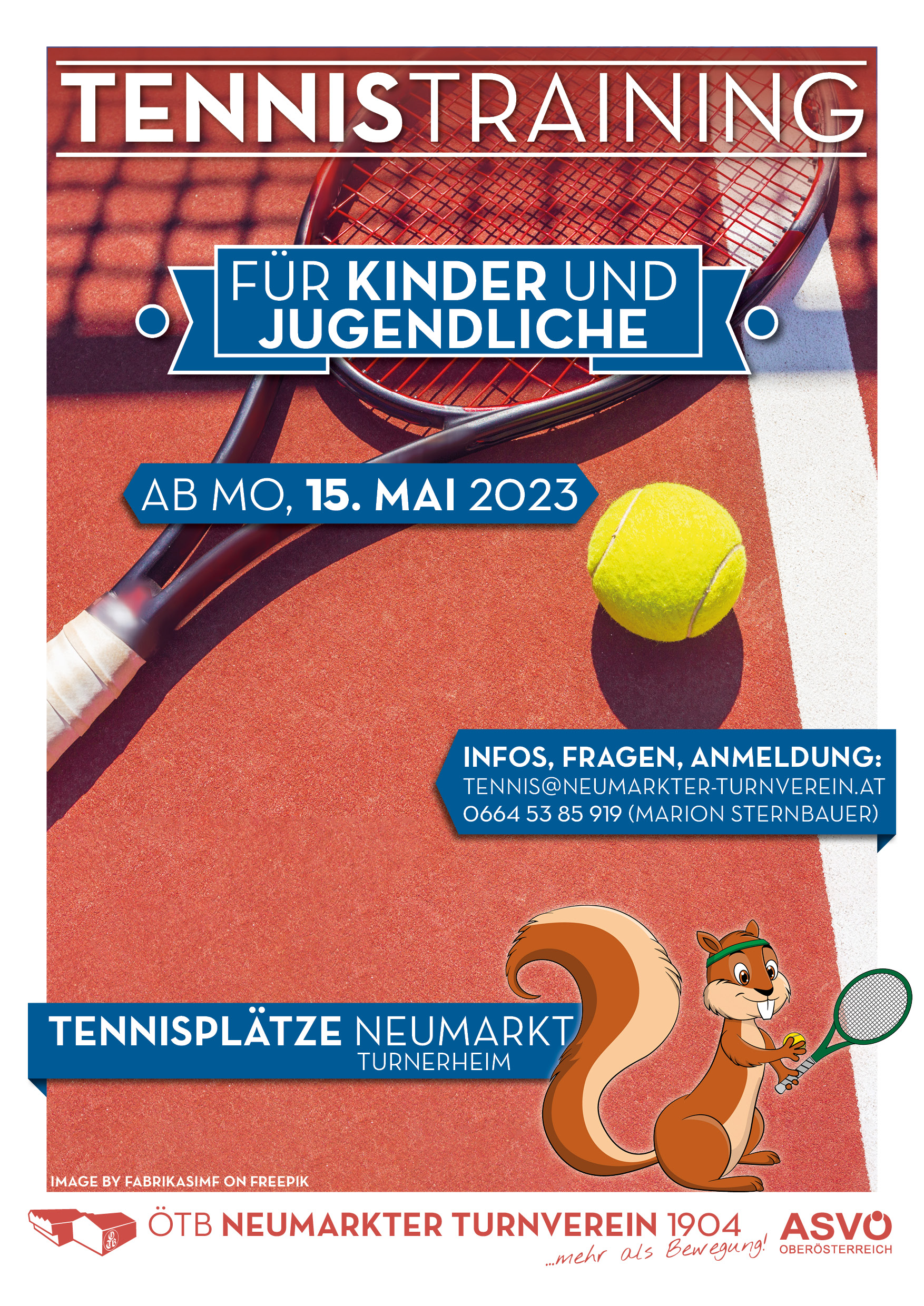 Ab Montag, 15. Mai 2023, startet unser Tennistraining für Kinder und Jugendliche! Alle Informationen dazu gibt’s unter tennis@neumarkter-turnverein.at oder auch telefonisch bei Marion Sternbauer: 0664 5385 919.