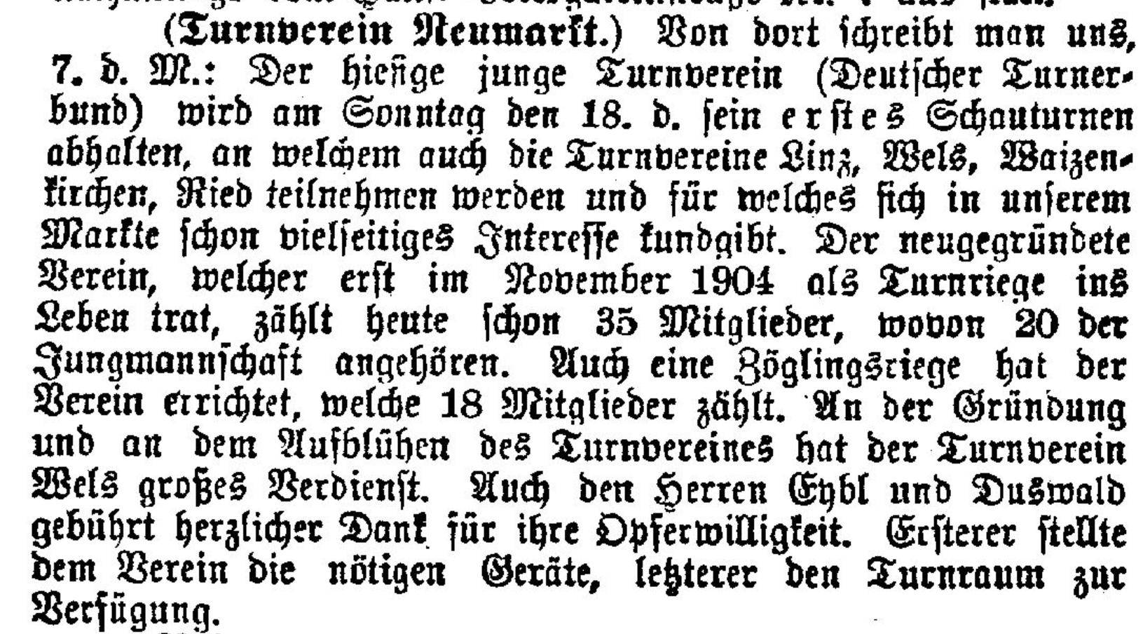 (Turnverein Neumarkt.) Von dort schreibt man uns, 7. d· M.: Der hiesige junge Turnverein (Deutscher Turnerbund) wird am Sonntag den 18. d. sein erstes Schauturnen abhalten, an welchem auch die Turnvereine Linz, Wels, Waizenkirchen, Ried teilnehmen werden und für welches sich in unserem Markte schon vielseitiges Interesse kundgibt. Der neugegründete Verein, welcher erst im November 1904 als Turnriege ins Leben trat, zählt heute schon 35 Mitglieder, wovon 20 der Jungmannschaft angehören. Auch eine Zöglingsriege hat der Verein errichtet, welche 18 Mitglieder zählt. An der Gründung und an dem Aufblühen des Turnvereines hat der Turnverein Wels großes Verdienst. Auch den Herren Eybl und Duswald gebührt herzlicher Dank. für ihre Opferwilligkeit. Ersterer stellte dem Verein die nötigen Geräte, letzterer den Turnraum zur Verfügung.