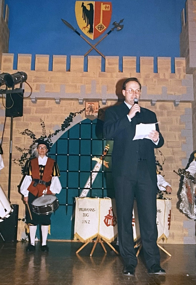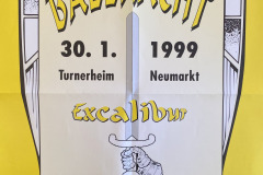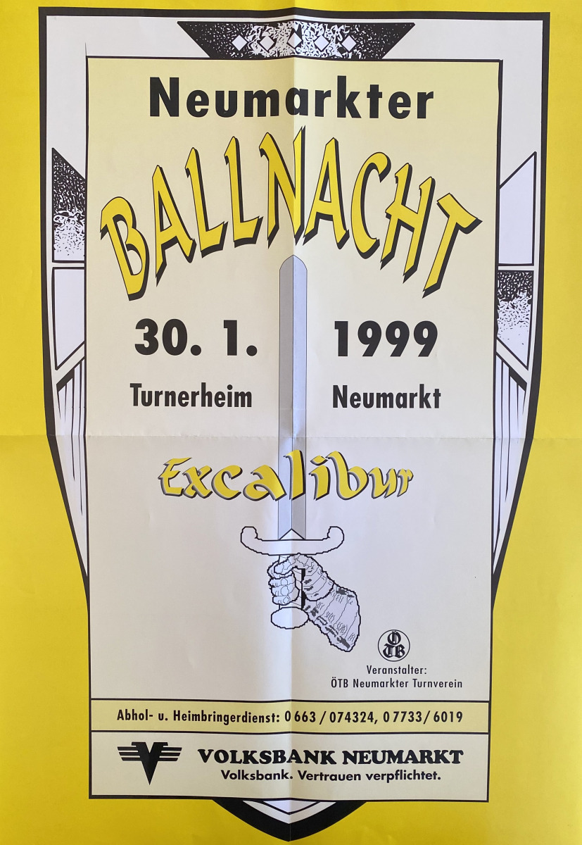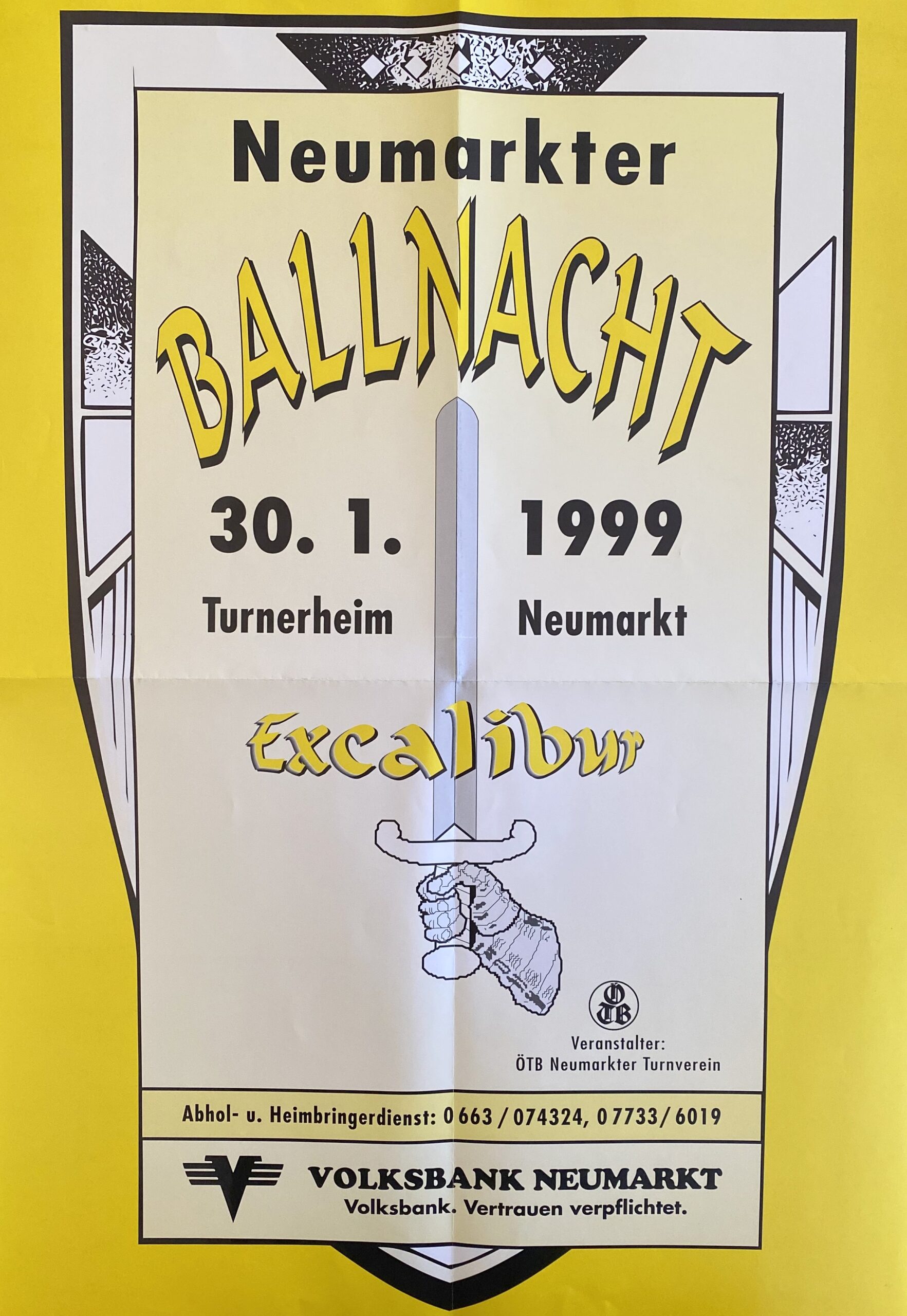 Excalibur – So hieß das heurige Motto für die 11. Neumarkter Ballnacht. Eine Steigerung bei der Besucherzahl war möglich. Nach fünfwöchiger Vorarbeit und ca. 1.200 freiwilligen Arbeitsstunden konnte am Samstag, den 30. Jänner 1999 Obmann Gerald Stutz pünktlich um 20:15 Uhr an die 700 Gäste begrüßen. Die Günter Ried Showband, zeichnete heuer bereits zum 8. Mal für die musikalische Verantwortung und ging somit als die „Ballnacht-Band“ in die Geschichte ein. Die Eröffnung gestaltete die Fanfarengruppe des befreundeten Spielmannszuges Linz, die unter der Leitung von Thomas Rizy zwei herrliche Stücke zum Thema passend spielten. Knapp vor Mitternacht begeisterten die Rope-Skippers aus Grieskirchen mit ihren Springschnüren die Gäste. Die Verlosung der vielen Hauptpreise, wie eine Reise nach Gran Canaria, Fernsehsessel, Autoradio oder Seenrundflüge, war ein weiterer Höhepunkt in dieser Nacht. Auch heuer sorgten wieder viele „Außenstellen“ für das leibliche Wohl der Gäste. Der Ritter-,Bierbrunnen, das Restaurant „Zur alten Schmiede“, der Heurige und auch die Kellerbar „The Londoner“. Auch im 1. Stock des Anbaues gab es wieder eine Bar mit cooler Musik. Neu waren der Bayerische Biergarten mit acht Weißbiersorten und eine Vinothek mit speziellen Weinen. In Summe gesehen kann man, ohne zu übertreiben, von einer perfekten Neumarkter Ballnacht sprechen, an deren Gelingen nicht weniger als 72 Turngeschwister, unter der hervorragenden Leitung der Festwarte Schatz Albin und Schöberl Christian, beitrugen. Auch der Beitrag des Regionalfernsehens erfüllte diesmal die Erwartungen und wir waren stolz, die Neumarkter Ballnacht im Fernsehen nochmals kurz Revue passieren zu lassen.