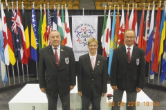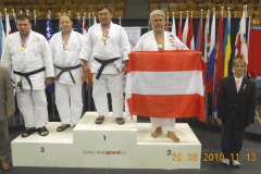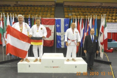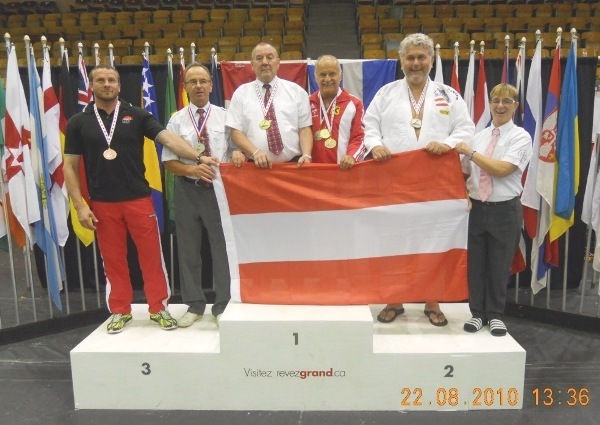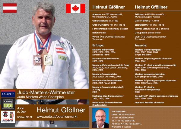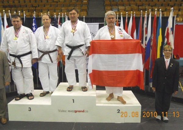 Judo-Masters-Vize-Weltmeister im Schwergewicht – Helmut Gföllner, Austria – so hieß es Ende August 2010 in Montreal in Kanada. Der 47-jährige Judo-Abteilungsleiter unseres ÖTB Neumarkter Turnvereines konnte den Weltmeistertitel, den er voriges Jahr in Atlanta erkämpfe, heuer mit der Silbermedaille „verteidigen“. Ja mehr noch: Durch das Antreten in der offenen Kategorie konnte der 2. Rang noch um einen hervorragenden 3. Platz ergänzt werden. Mit diesen beiden Medaillen Nummer 21 und 22 ist der Neumarkter Polizist Gföllner der erfolgreichste Judo-Masters-Kämpfer weltweit. Auch von allen anderen knapp 700 Teilnehmern aus 37 Nationen war er mit diesen Platzierungen ganz vorne angesiedelt. Dabei waren die Kämpfe in der Schwergewichtsklasse über 100 kg alles andere als einfach. Das Starterfeld wird immer schwieriger und professioneller und so standen Helmut in seiner Klasse 11 weitere Kämpfer aus aller Welt gegenüber, zum Teil ehemalige Olympiateilnehmer. In den entscheidenden Kämpfen konnte er sich aber jeweils gegen kanadische, amerikanische und englische Judoka, alle mit einer Ippon-Wertung durchsetzen. Nur im Finale war gegen einen technisch perfekten Kasachen Schluss.