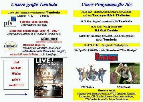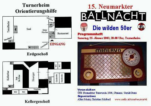 Nach 5-wöchiger Vorarbeit und genau 1.436 freiwilligen Arbeitsstunden konnte am Samstag, den 25. Jänner 2003 Obmann Vbgm. Gerald Stutz pünktlich um 20.15 Uhr über 700 Gäste begrüßen, darunter einige Bürgermeister der Umgebung. Als Dekoration für oö schönst dekorierten Ball wurde ein Flair der sogenannten “wilden 50-er Jahre“ aus Holz nachgebaut, die Nachbildung eines 8 x 4 m großen Kofferradios war der absolute Höhepunkt. Die Showband “Die Könige“ zeichnete heuer zum zweiten Mal für die musikalische Veranwortung.