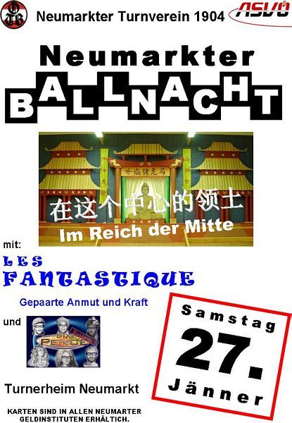 ‚Im Reich der Mitte“ – so hieß das heurige Motto für die 19. Neumarkter Ballnacht. Nach 5-wöchiger Vorarbeit und genau 1.368 !!!! freiwilligen Arbeitsstunden konnten am Samstag, den 27. Jänner 2007 um 20.15 Uhr knapp 700 Gäste vom Obmann des ÖTB Neumarkter Turnvereines – VBgm. Gerald Stutz – begrüßt werden, darunter die Bürgermeister unserer beiden Gemeinden Neumarkt und Kallham. Als Dekoration für oö schönst dekorierten Ball wurde wieder ein Flair aus “dem Reich der Mitte“ aus Holz nachgebaut. Die Showband “Six Pence“ zeichnete heuer zum vierten Mal für die perfekte musikalische Verantwortung. Die Mitternachtseinlage bestritt die 9-fache österr. Staatsmeisterin in der rhythmischen Gymnastik Monika Brandstetter aus Linz, die mit ihrer perfekten Show “Les Fantastics“ einen Höhepunkt bildete.
