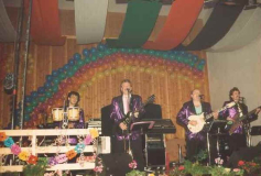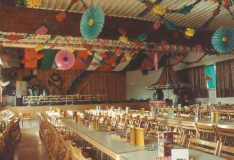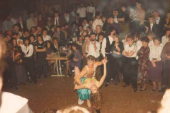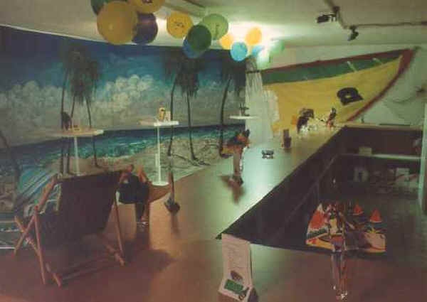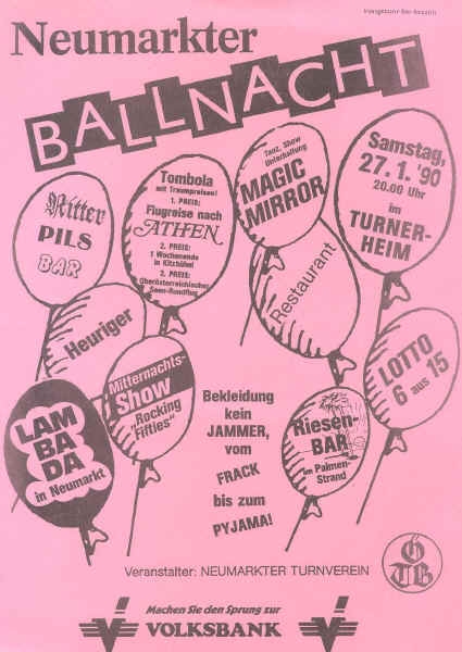 Zum 2. Mal lud unser Turnverein zur Neumarkter Ballnacht ins Turnerheim ein. Nachdem im Vorjahr im Heuriqen eine wunderbare Dekoration qeschaffen wurde. ließ es sich die Tennisabteilunq nicht nehmen und ersuchte ebenfalls Tbr. Mayrhofer Karl, eine Kulisse für die Riesenbar zu zaubern. Wochen vorher begannen die Vorbereitunqen und nachdem das Motto PALMENSTRAND gefunden war, begann der Künstler mit seiner Arbeit. Auch einige Hobbymaler fanden sich ein und halfen so qut es ging. Dass es dabei natürlich nicht immer tierisch ernst zuging, versteht sich von selbst. Das Resultat war jedoch wiederum wunderbar und ziert auch die Titelseite dieser Turnerpresse. Auch alle anderen Arbeiten begannen schon 14 Tage vorher und so konnte Obmann-Stv. Gerald Stutz am Tag „X“ um 20.15 Uhr über 500 Gäste begrüßen. Surfbretter sowie andere Südsee-Kulissen rundeten das perfekte Strandbild der Riesenbar am Palmenstrand ab, die sich auf einer Länge von 17 Metern den Gästen präsentierte. Ein Tanzschulgruppe aus Wels zeigte Tango und Cha-Cha-Cha, sowie den Tanz des Jahres 1989, den Lambada. Auch die Frankenburger hatten ein neues Stück einstudiert und um 24.00 Uhr folgte die Mitternachtseinlage der Band. Auch heuer sorgten wieder viele „Außenstellen“ für das leibliche Wohl der Gäste. So erfrischte die Ritter-Pilsbar neben der Tanzfläche zwischen flotten Tänzen. Das Eiszeit-Restaurant, auch heuer wieder abstrakt dekoriert, verwöhnte die Gäste mit Spezialitäten. Der Heurige lud auch diesmal wieder zu erlesenen Weinen, die in der herrlichen Kulisse nochmal so gut schmeckten. Die Verlosung der Hauptpreise, eine Flugreise nach Athen, ein Wochenende in Kitzbühel sowie einen OÖ Seenrundflug war ein weitere Höhepunkt in dieser Nacht. Zum Schluss gab es noch die Ziehung der Nummern für das Lotto 6 aus 15, ehe die Band zur letzten Runde um 3.00 Uhr aufspielte.