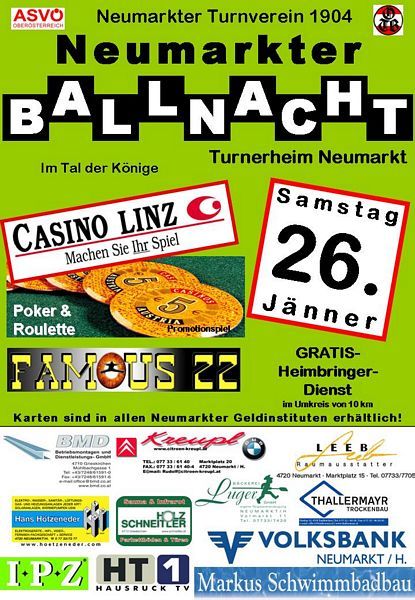 Die Verlosung der vielen Hauptpreise, wie ÖAMTC-Sicherheitstrainings, Seenrundflüge und Einrichtungsgutscheine im Wert von je EUR 500,– war ein weiterer Höhepunkt in dieser Nacht. Auch heuer sorgten wieder viele “Außenstellen“ für das leibliche Wohl der Gäste. Die Ritter Pils-Bar, das Restaurant, der Heurige und auch die Kellerbar “Sir Prise“. Auch gab es in der sonstigen Werkstätte wieder das Pub “Everytime“ und in der Vinothek erfreute heuer Judo-Masters-Weltmeister Helmut Gföllner mit speziellen Weinen viele Hobby-Someliers. Nachdem er nicht nur wochenlang an der Dekoration mitarbeitete, sondern auch hauptverantwortlich für die Vinothek zeichnete, gab es heuer einen besonderen Wein zu verkosten. Gföllner besitzt ja einen eigenen Weingarten, wo die Urrebe „Uhudler“ angebaut wird. Und dieser eigene, besondere Wein mit dem Namen seines verstorbenen Bruders „Bobanus“ kam natürlich beim sehr fachkundigen Weinpublikum besonders gut an. Die Casinos Austria waren bei diesem Jubiläum ebenfalls mit einem Roulette- und Poker-Tisch vertreten. Die Erlöse ergehen an die Kinderkrebshilfe OÖ. In Summe gesehen kann man, ohne zu übertreiben, von einer perfekten Neumarkter Ballnacht sprechen, an deren Gelingen nicht weniger als 76 Turngeschwister, unter der hervorragenden Leitung der Festwarte Schatz Albin und Schöberl Christian, beitrugen. Nach wenigen Stunden Schlaf trafen sich dann um 13.00 Uhr wieder 34 Turngeschwister und pünktlich um 19.00 Uhr waren im ganzen Turnerheim alle Ballspuren beseitigt. Danach gab es die obligate Ballnacht-Jause, ehe Festwart Albin Schatz die heiß ersehnten und spannenden Umsatzzahlen etc. bekannt gab.