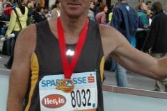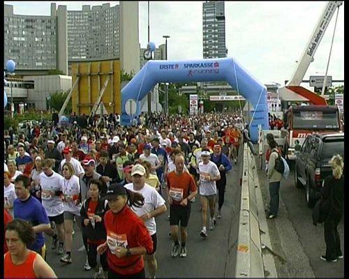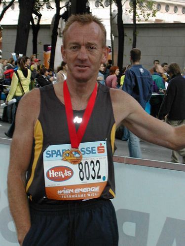 Bereits am Vortag reiste ich mit meiner Frau Sibylle zur Startnummernausgabe im Messegelände mit den ÖBB an. In der U-Bahn bzw. Straßenbahn begegneten einem fast nur Leute mit dem hellblauem Startsackerl des VCM. Die Nacht verbrachte ich bei Verwandten in Floridsdorf. Nach dem Frühstück um 6 Uhr begab ich mich gemütlich zum Startbereich bei der Uno City. Es war wieder ein irrsinniger Menschenauflauf von ungefähr 20.000 Laufbegeisterten, welche den Startbereich füllten. Jedoch bestritten „nur“ 5.911 den ganzen Marathon von 42,195 km, der mit sehr guten Wetterbedingungen ( 14 °C tw. Sonnenschein u. Windböen ) zum bisherigen Höhepunkt meiner 5 Jährigen Laufzeit wurde. Vom Start weg lief ich mit Baumgartner Otto und Roth Roland ein recht flottes Tempo und wir konnten dabei noch ein bisschen quatschen. Nach ein paar Kilometern suchte jeder Läufer sein eigenes Lauftempo, wobei wir uns aus den Augen verloren. Mit einer Kilometerzeit von 4:20 min/km bestritt ich die ersten 10 km. Nach der Halbmarathondistanz von 21 km zeigte die Zeitnehmung 1 Stunde 33 Minuten, das eigentlich um 4 Minuten zu schnell war, aber ich fühlte mich sehr gut und behielt das Tempo bei. Nach einem kurzen Durchhänger bei ungefähr 25 km lief ich 20 Minuten bis zur Prater Hauptallee etwas langsamer um mich wieder zu erholen. In der endlos langen Hauptallee sah ich bekannte Zuseher und Läufer, die meinem Körper wieder Flügel verliehen.