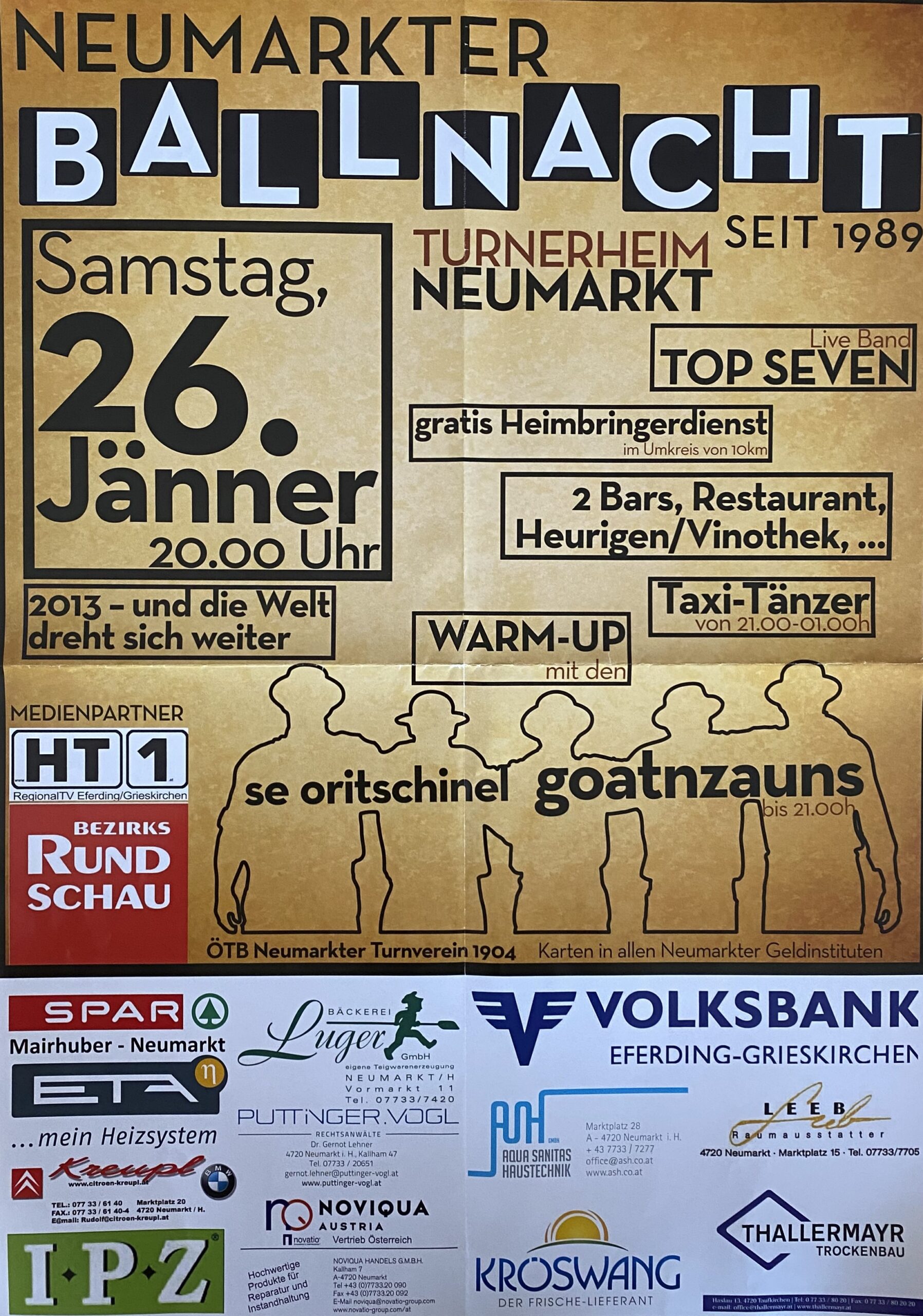 ‚2013 – und die Welt dreht sich weiter“ – so hieß das heurige Motto für die 25. Neumarkter Ballnacht. Nach 5-wöchiger Vorarbeit und mehr als 1200 !!!! freiwilliger Arbeitsstunden konnten am Samstag, den 26. Jänner 2013 um 20.15 Uhr knapp 500 Gäste von unserem Obmann Vbgm. Gerald Stutz begrüßt werden. Als Kulisse für OÖ schönst dekorierten Ball wurde wieder ein Flair aus dem Reiche der Maya´s aus Holz nachgebaut. Zum Jubiläum gab es gleich ein Warm-Up-Konzert der Se Oritschinel Goatnzauns, die das pünktlich erschienene Publikum im Saal auf ihre lustige und perfekte Art in die richtige Ballstimmung versetzten. Die Showband “Top Seven“ zeichnete heuer zum zweiten Mal für die perfekte musikalische Verantwortung. Eröffnet wurde die Ballnacht von einer Vorführung der der Show-Tanzgruppe Akro(e)motion unseres befreundeten Turnvereines Münzkirchen, die auch eine super Mitternachtseinlage zum Motto passend bestritten.