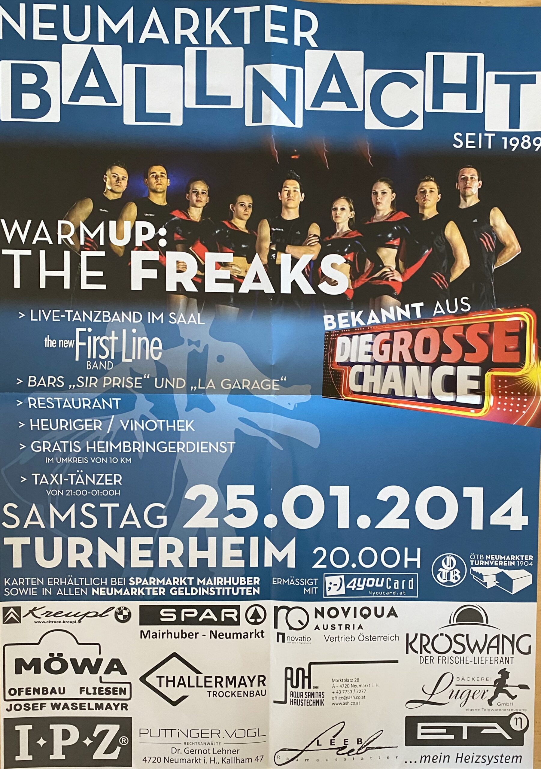 „The Freaks“ aus St. Valentin eröffneten vor zahlreichen Besuchern die 26. Neumarkter Ballnacht im Turnerheim. Der Ballsaal war perfekt dekoriert mit Pyramiden und Urwäldern aus dem Reich der Maya. Die neue Tanzband „The First Line Band“ eröffnete nach den Begrüßungsworten von Obmann Gerald Stutz das Tanzparkett mit einem Walzer und schnell war die Tanzfläche bis auf den letzten Platz gefüllt.