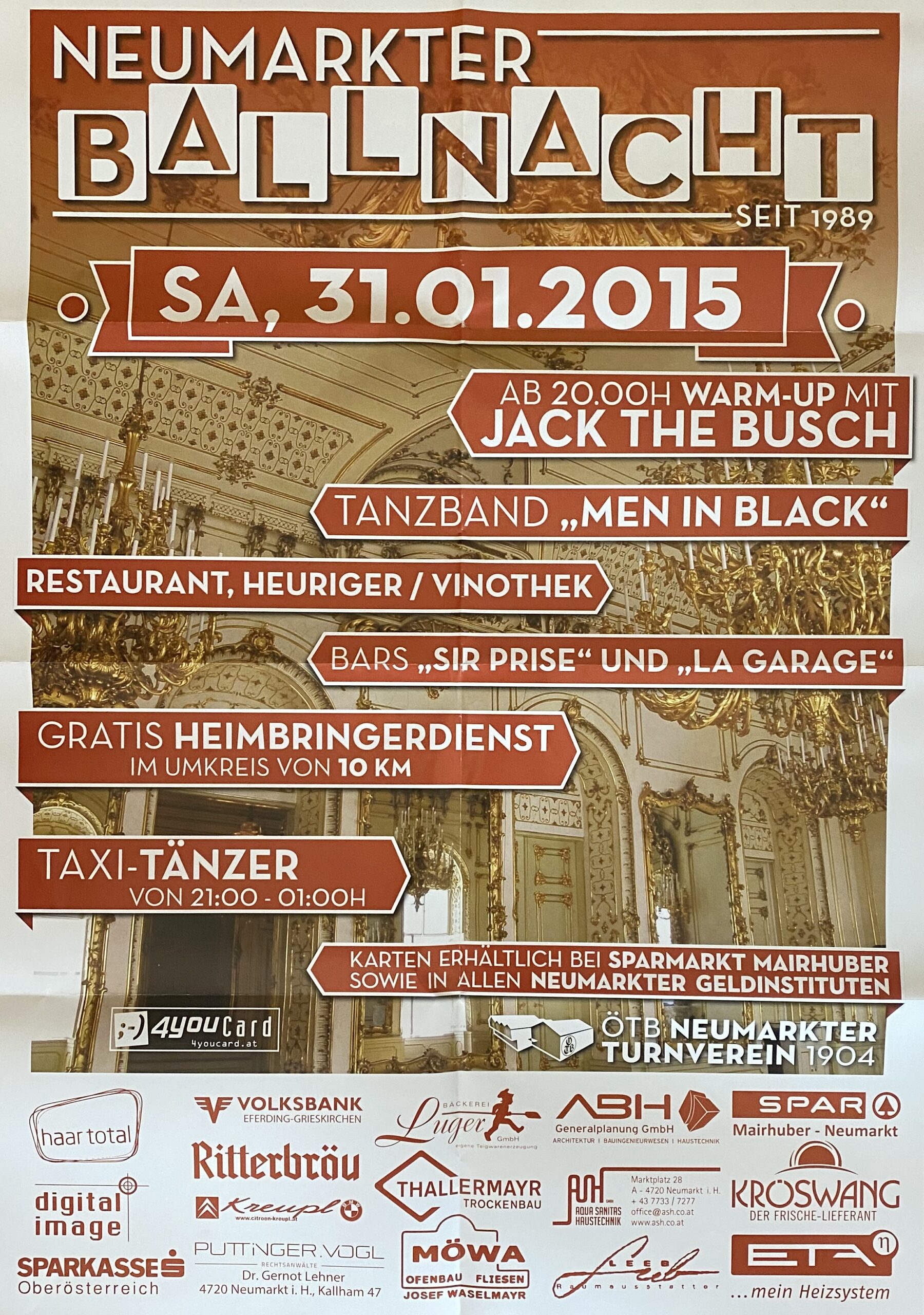 Bereits zum 27. Mal wird Neumarkt am 31. Jänner 2015 wieder zur Ballhochburg im Landl-Bezirk. Die Neumarkter Ballnacht ist weit über Neumarkt/Umgebung hinaus bekannt für ihren einzigartig dekorierten Ballsaal. „Nachdem unser Fokus in den letzten Jahren vor allem auf historischen Bauwerken lag wurde heuer ein völlig neues Konzept in Angriff genommen. Mit 650 m2 Stoff und 3.600 LED Lampen werden wir unser Turnerheim in einen historischen Ballsaal verwandeln“ kündigt Dekorationschef Manfred Schöberl an. Kaiserlich-königliches Flair und Wiener Walzer dienen als stimmige Vorlage für den Tanzsaal. Ballnacht-Chef Albin Schatz freut sich besonders auf die Eröffnungsshow ab 20:00 Uhr: „Mit Jack the Busch konnten wir einen beeindruckenden Musiker und Chartstürmer engagieren, der unsere Gäste mit seinen stimmungsvollen Liedern begeistern wird.“ Neben dem großen Ballsaal warten auf die Besucher auch eine Cocktail-Bar, das Restaurant, der gemütliche Heurigen mit Vinothek und in den Kellerräumen ein eigener Floor mit elektronischer Musik. Das ist viel Aufwand für einen Abend. Dazu Turnverein-Obmann Gerald Stutz: „Die vielen Stunden Arbeit im Vorfeld sind schnell wieder vergessen wenn man am 31. Jänner in die begeisterten Gesichter der Ballbesucher blickt.“ Mit der Tanzband „Men in Black“, original Taxitänzern, gratis Heimbringerdienst, großer Tombola und der beschwingten Mitternachtseinlage vom „Rock’n’Roll und Boogie Woogie Club Top Show Askö Traun“ ist ein amüsanter Abend garantiert!