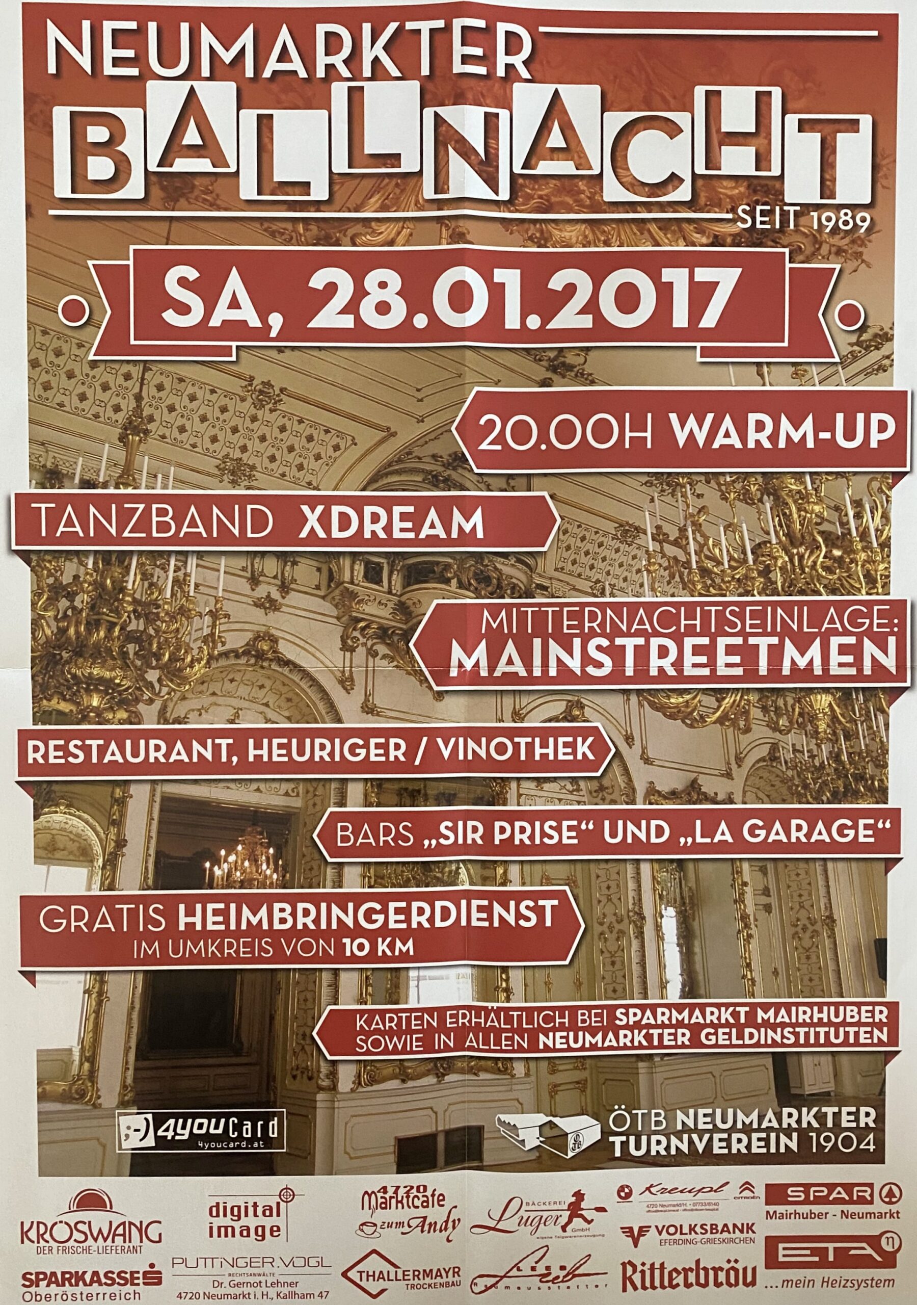 Die 29. Neumarkter Ballnacht, dem Highlight im Landl-Ballkalender, ist Geschichte. Am 28. Jänner 2017 luden wir in den historischen Ballsaal mit seinem kaiserlich-königlichen Flair. Die schweren roten Vorhänge, Fenster im Stil des Schlosses Schönbrunn, goldene Säulen und historische Gemälde sowie tausende LED-Lichter schufen ein Flair, das seines gleichen sucht. Eröffnet wurde der Abend von den Tänzerinnen der „StageBreakers“, ehe Gastgeber und Obmann des Turnvereins Konsulent Gerald Stutz die Ballnacht traditionell mit einem Wiener Walzer eröffnete. Für die musikalische Umrahmung zeichnete erstmals in ausgezeichneter Manier die Showband „XDream“ verantwortlich. Während sich die einen bei guter Tanzmusik auf der Tanzfläche vergnügten, begaben sich die anderen in die berühmt-berüchtigten Kellerräume des Turnerheimes. So bot der gemütliche Heurige, wie immer, eine gut sortierte Weinkarte und die beiden Kellerbars „Sir Prise“ und „La Garasch“ Cocktails und Longdrinks bei cooler Musik. Um Mitternacht begeisterte die Einlage der „MainStreetMen“ die BallbesucherInnen. Die fünf Jungs aus Wiener Neustadt sangen live die größten Hits der Backstreet Boys, Take That, ‚NSync und Co. Nicht fehlen durften natürlich die entsprechenden Boyband-Moves. Die Ermittlung der Tombola-Losfarbe erfolgte unmittelbar im Anschluss an diese eindrucksvolle Mitternachtseinlage. Als dann lange nach Mitternacht die Tanzmusik im Saal endete, wechselten die zahlreichen verbliebenen Gäste in die Außenstellen (Bars), wo sie noch bis in die frühen Morgenstunden weiterfeierten. Viele von denen, die sich um diese Zeit auf den Heimweg machten, nutzten das Angebot des Heimbringerdienstes, das sie im Umkreis von zehn Kilometern gratis nach Hause brachte. Und wer 2017 nicht dabei war, hat am Samstag, 27. Jänner 2018 bei der 30. (!!) Neumarkter Ballnacht wieder Gelegenheit sich vom Flair des „Kaiserlichen Ballsaales“ und von der außergewöhnlichen Stimmung zu überzeugen bzw. beeindrucken zu lassen. Seien auch Sie dabei!