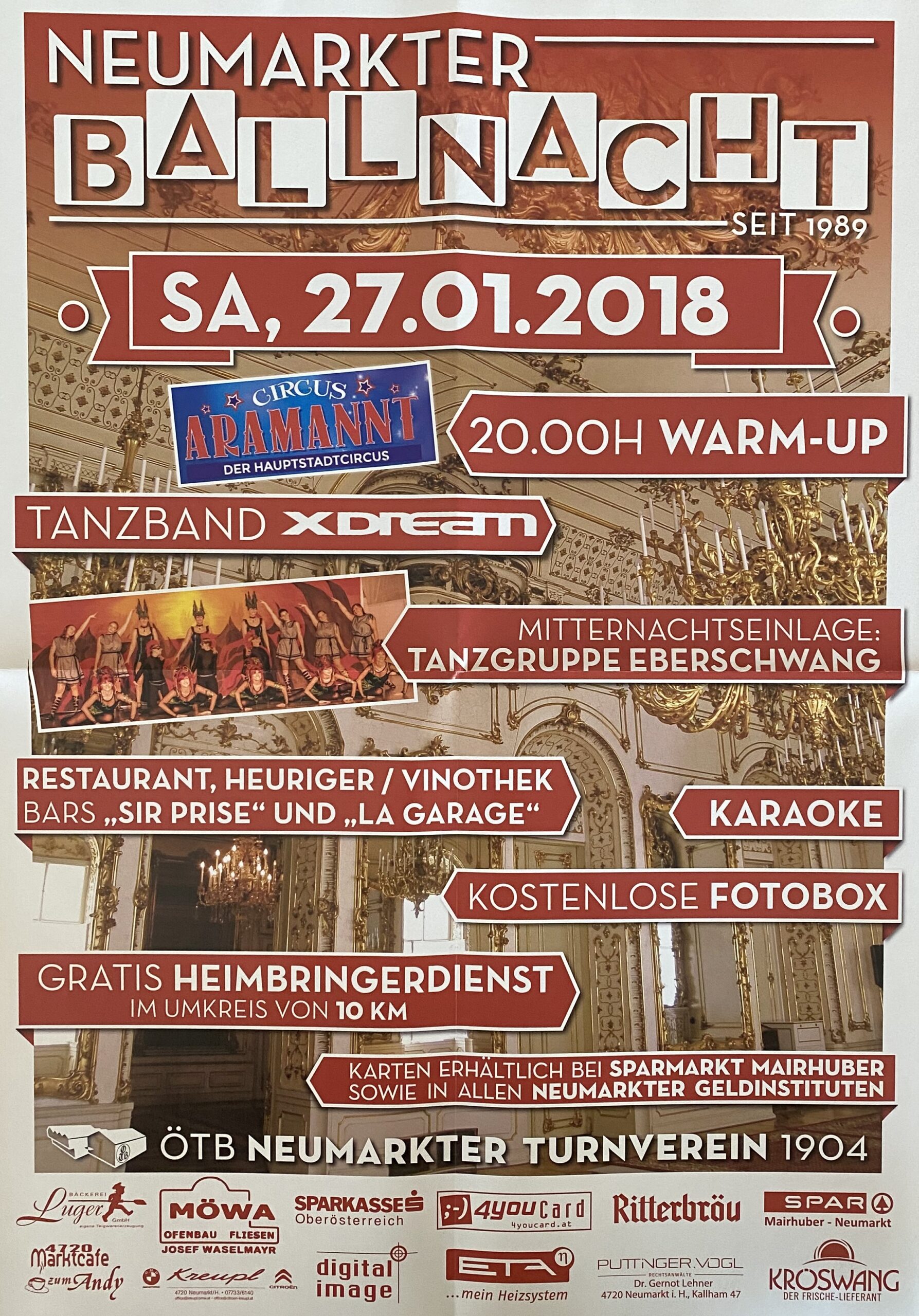 Die Jubiliäumsballnacht (30. Neumarkter Ballnacht) war auch heuer wieder das Ball-Highlight im Landl-Kalender. Im historischen Ballsaal mit seinem kaiserlich-königlichen Flair, das seines gleichen sucht, wurde der Abend mit einem „Warm Up“, dargebracht von den Kindern des Wanderzirkus „Aramannt“, eröffnet. Der aus Berlin stammende Zirkus hat im Raum Vöcklabruck sein Winterquartier aufgeschlagen. Und so freute sich der ÖTB Neumarkter Turnverein mit dem Engagement des Zirkus, diesen in der spielfreien Zeit unterstützen zu können. Die Kinder im Alter von 8 bis 13 Jahren verzauberten die Ballgäste mit einer Solonummer am Drahtseil, mit ihrer Taubenrevue und mit ihren zahlreichen Hula Hoop Reifen. Die beiden älteren Schwestern verwendeten dabei auch einen brennenden Hula Hoop Reifen. Die jüngste der drei Schwestern begeisterte zudem in der Rolle einer Clownesse. Daran anschließend eröffnete Obmann Konsulent Gerald Stutz die Ballnacht traditionell mit einem Wiener Walzer. Für die musikalische Umrahmung zeichnete auch heuer wieder in ausgezeichneter Manier die Showband „XDream“ verantwortlich. Um Mitternacht entführte die Tanzgruppe des ÖTB Eberschwang die BallbesucherInnen in die griechische Unterwelt. Die Tanzgruppe war Teilnehmer der Worldgymnaestrada in Lissabon, Dornbirn, Lausanne und zuletzt in Helsinki mit ihren Modern Dance Choreographien. Das Highlight der Ballnacht war jedoch die Retro-Fotobox, die von den Ballgästen regelrecht gestürmt wurde. Mehr als 500 Fotos wurden bis Mitternacht mit und ohne Requisiten geschossen. Die Bilder/Fotos zeigen: Den Ballbesuchern hat es sichtlich Spaß gemacht. Bis spät in die Nacht wurde im Ballsaal getanzt und bis in die Morgenstunden in den Bars ausgiebig gefeiert. Und wer 2018 nicht dabei war hat am 26. Jänner 2019 wieder Gelegenheit sich vom Flair des „Kaiserlichen Ballsaales“ und von der außergewöhnlichen Stimmung auf der Neumarkter Ballnacht zu überzeugen bzw. beeindrucken zu lassen.