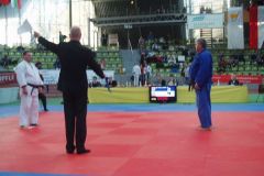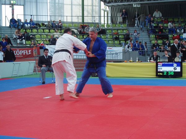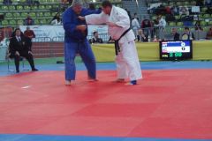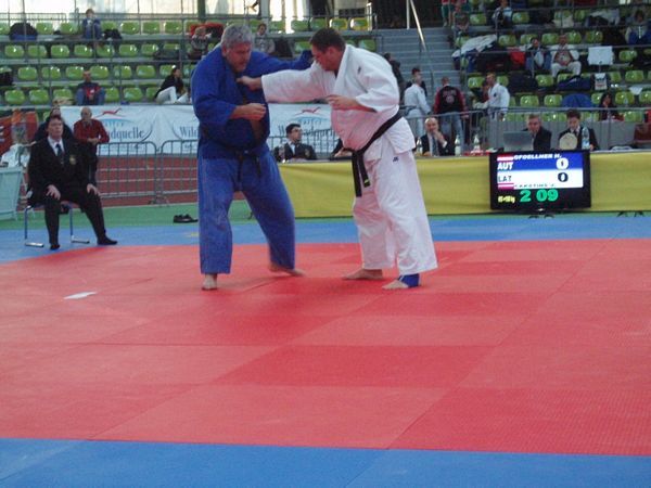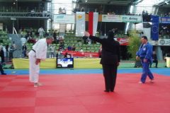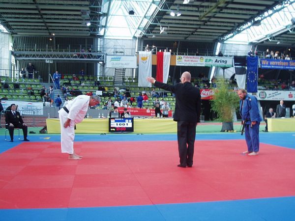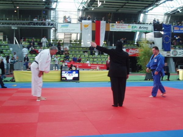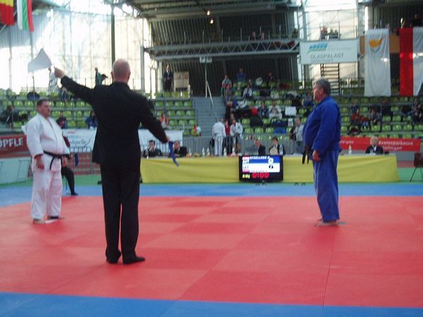 Zum Kampfverlauf: Der erste Kampf war ja noch vielversprechend, benötigte er doch nur 20 Sec. für ein schönes Ippon gegen einen deutschen Judoka. Da wir aber beim zweiten Kampf mit Hatei (Kampfrichterentscheid) mit 1:2 unterlagen, gab es nur die Hoffnungsrunde. Auch für den 3. Kampf benötigte er wieder nur 29 Sec. gegen einen Engländer. Und der entscheidende Kampf um den 3. Platz wurde durch eine Kampfrichter-Fehlentscheidung mit 0:3 gegen Helmut entschieden. Bei einem Schiabfahrtslauf würde es heißen, „um 2 Hundertstl“ verloren. Noch dazu wurden wir bei dieser Meisterschaft um eine zweite Chance bestohlen, da die offene Kategorie einfach gestrichen wurde und der Teambewerb bereits im April in Estland stattfand. Was soll´s, immer kann man nicht gewinnen, wenn dies auch das zweite Antreten bei einer Europameisterschaft ohne Medaille war. Im Klartext: keinen Kampf verloren und doch nur 5.