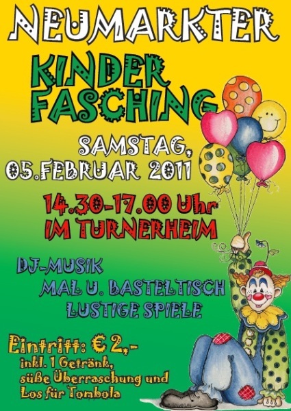 An die 300 verkleidete Kinder, Eltern, Großeltern, Tanten und Onkeln besuchten den inzwischen 8. Neumarkter Kinderfasching im Turnerheim. Bei Spielen wie Dosenschießen, Sesselspiel, Süßigkeitenschleuder oder Malen wurden die Kinder bei Laune gehalten. Die Großen konnten sich in dieser Zeit bei Kaffee und Krapfen unterhalten. Gekonnt führte Jugendwartin Karin Stutz durchs Programm. So viele Gäste erfordert den Einsatz von vielen Kellnern und Spielebetreuern. Ein herzliches Dankeschön an unsere Turnerjugend, die beim Kinderfasching immer wieder gerne mithilft.