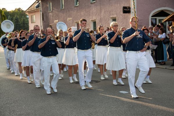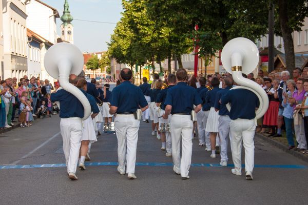 Der Spielmannszug erhielt eine Einladung von der Stadtkapelle Grieskirchen als Gastkapelle beim Bezirksmusikfest dabei zu sein. Gerne nahmen wir diese an, absolvierten zur Sicherheit ein paar Marschproben und konnten gut vorbereitet beim Empfang der Gastkapellen Freitagabend einmarschieren. Mitten unter zahlreichen anderen Musikkapellen defilierten wir gekonnt vor den lokalen Größen von Blasmusikverband, Politik und Ortsprominenz. Nach dem feierlichen Festakt marschierten wir direkt ins Festzelt, wo schon reservierte Plätze und ein kleines Fass Bier auf uns warteten. Im Festzelt passten wir uns schnell und instinktiv den Blasmusikgepflogenheiten an und standen bald auf den Bänken mit einem Doppler in der Hand. Bezirksmusikfest – ein netter Brauch!