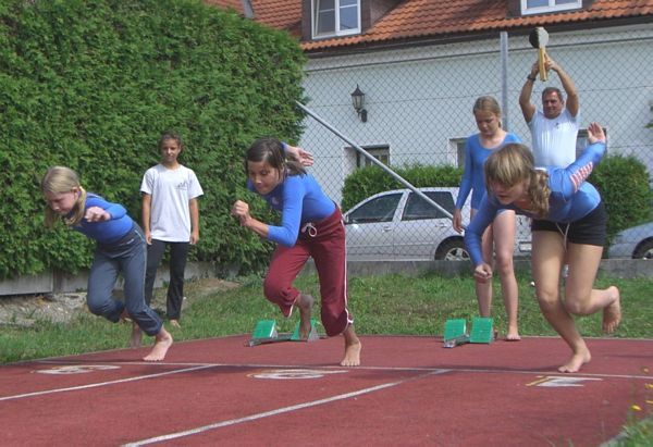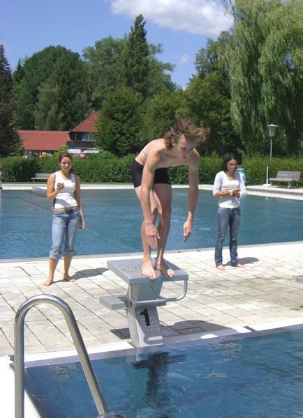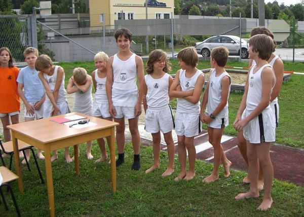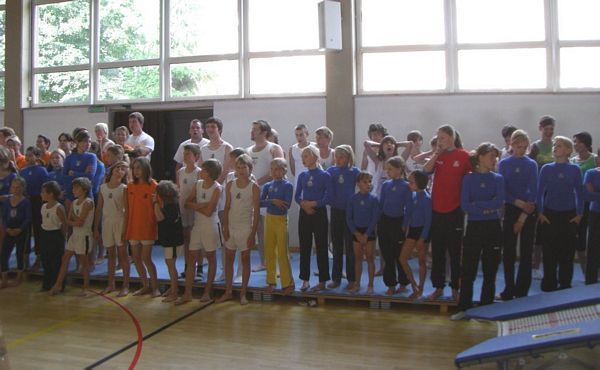 Nachmittags begannen die anstrengenden Turnfestwettkämpfe mit den Schwimmbewerben, wobei unser Jürgen Ruttinger, einer der Jüngsten von allen Teilnehmern, die beste Schwimmzeit erzielen konnte. Nach diesem anstrengen Wettkampf, es musste noch an sieben Geräten geturnt werden, und auch Weitspringen, Kugelstoßen und Laufen war dabei, waren unsere beiden Wettkämpfer Jürgen Ruttinger und Florian Ernst ziemlich geschlaucht, wir aber waren stolz auf sie. Nach Ende sämtlicher Wettkämpfe konnte Dank des guten Teams bei der Auswertung, Chefin war unsere Bianca Wassermayr, die ein eigenes Wertungsprogramm ausgearbeitet hatte, die Siegerehrung für die Jugendwettkämpfe durchgeführt werden. Vorher zeigte aber noch eine Dänische Jugendgruppe, die auf Tournee war, und in Grieskirchen Station während des Turnfestes machte, ihre großartige Vorführung auf der „Dumblingbahn“.
