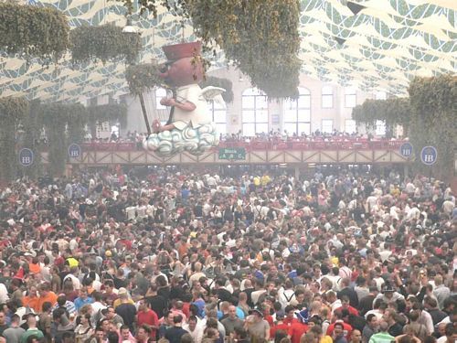 – die Festlichkeiten dort von Musikkapellen umrahmt werden, die offensichtlich nur über ein sehr kleines Repertoire verfügen und deshalb beinahe alle zehn Minuten „Ein Prosit“ zum Besten geben.