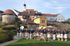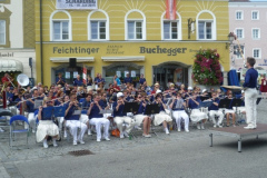 Am Sonntag Vormittag trat der Neumarkter SZ ein weiteres Mal an und konzertierte am Schärdinger Hauptplatz vor wesentlich mehr Publikum. Der Rätsellauf des Turnfestes war gerade im Gange und der ganze Stadtplatz war schon vorbereitet für die mittags stattfindende Siegerehrung. Auch das Großkonzert aller österreichischen Spielleute mit ca. 150 Musikern fand am Vormittag statt. Wieder saßen die Spielleute bei großer Hitze unter der prallen Sonne, wenigstens das zahlreiche Publikum fand Platz unter den unzähligen Sonnenschirmen. Es wurde recht gut zusammengespielt und der Apllaus gab uns recht. Bei der Siegerehrung des Turnfestes kam der Groß-SZ auch noch einige Male zum Einsatz. Nach dem Ende verabschiedeten wir uns schließlich von unseren SZ-Kollegen aus ganz Österreich und traten die kurze Heimreise an.