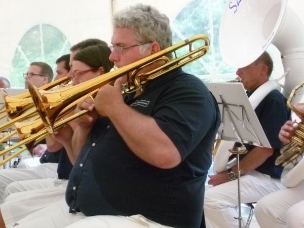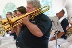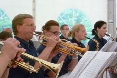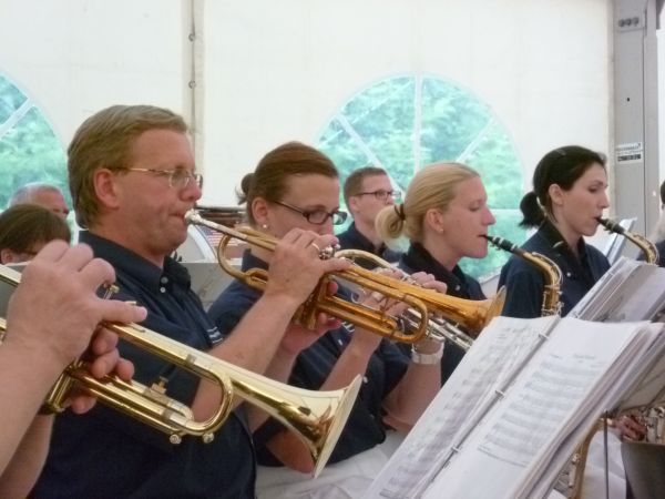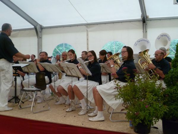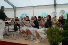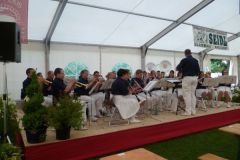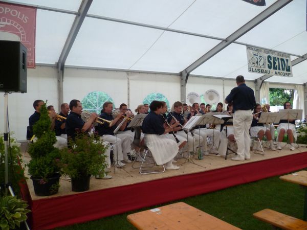 Und so traf sich der Spielmannszug am heißesten Wochenende des Jahres bei 35 Grad im Schatten, packte Instrumente und Notenständer ein und fuhr Richtung Raab. Zum Glück wurde das Festzelt gut durchlüftet, die Hitze hielt sich einigermaßen in Grenzen und es fanden sich trotz der hohen Temperaturen viele Gäste ein. Von 19:00 – 21:00 Uhr gab der Spielmannszug ein bunt gemischtes Repertoire zum Besten, von Marschmusik bis moderner Literatur. Das Publikum war sehr zufrieden und so mancher Doppelliter Bier fand den Weg auf die Bühne zu den durstigen und schwitzenden Spielleuten. Nach dem Einsatz blieben wir noch eine Weile und lauschten dem nächsten Programmpunkt der Tanzband “Top 2“ mit Inge Reidinger, der Obfrau vom ÖTB Turnverein Münzkirchen.