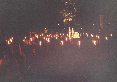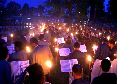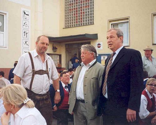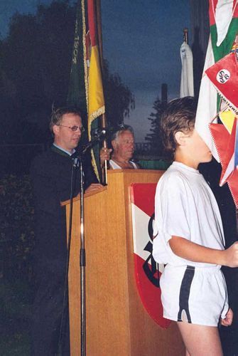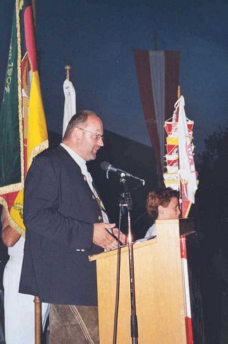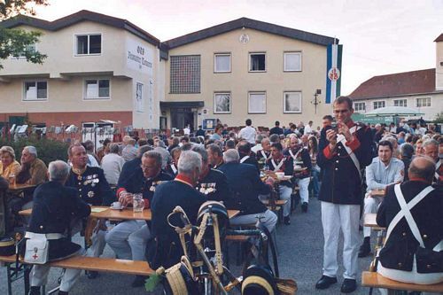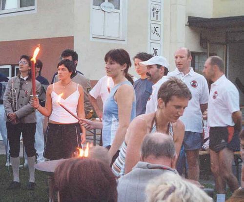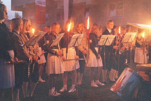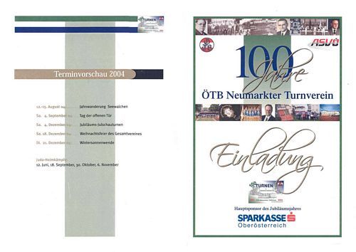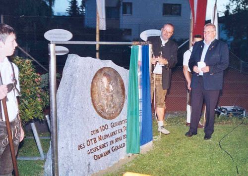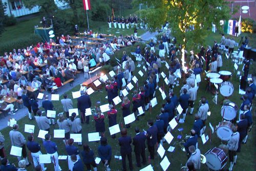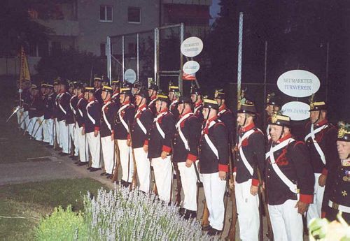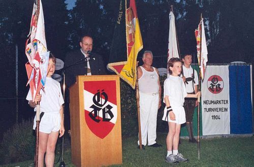 145 Musiker aus 4 Kapellen spielten am Samstag, den 26. Juni 2004 um 21.30 Uhr bei unserem Turnerheim den “Grossen österreichischen Zapfenstreich“. Aus Anlass unseres 100. Geburtstages wurde ein Jahndenkmal zu Ehren des Begründers des modernen Turnens “Turnvater Friedrich Ludwig Jahn“ enthüllt. Mit dem gemeinsam gespielten 47-er Regimentsmarsch eröffneten die Musiker diesen Abend. Bevor die Enthüllung so richtig los ging, überbrachten Staffelläufer unseres Vereines eine Grußbotschaft vom Jahndenkmal am Maierhoferberg, die von unserem Bezirksobmann Franz Eisterer verfasst wurde. In Anwesenheit vieler Ehrengäste wie NR Wolfgang Großruck, der umliegenden Bürgermeister, der ÖTB-Bundesobmänner Wieland Wolfsgruber und Günther Atzmanninger, der die Festrede hielt, nahm Kaplan John die Segnung dieses wunderschönen Denkmales vor. Nach der Enthüllung, des von Obmann VBgm Gerald Stutz gespendeten Jahndenkmals, begannen die Trachtenkapellen Kallham und Kimpling, der Eisenbahnermusikverein Neumarkt und unser Spielmannszug, zusammen 145 Musikerinnen und Musiker mit der gemeinsamen Aufführung des Zapfenstreiches. An die 100 Fackeln und 20 Scheinwerfer, sowie 37 Mann der Bürgergarde Regau sorgten für die richtige Stimmung, an der sich knapp 450 Personen erfreuen konnten. Als Solisten traten der Landesmusikschuldirektor Manfred Pichler und Josef Huemer aus Kallham hervor. Unter den Zuhören auch der Chefdirigent und der Manager des Zentralorchesters der Tschechischen Armee, der uns einen eigenen “Neumarkter Turnermarsch“ komponierte und welcher an diesem Abend auch uraufgeführt wurde. Mit einem Start von 200 Luftballons mit Grußkarten und einem fulminanten Feuerwerk schloss diese beeindruckende Feier um 22.30 Uhr. Sofort spielten anschließend SAM aus Kallham auf der Turnerheimterrasse ihre flotten Stücke. Dank des herrlichen Abends blieben auch die Gäste lange bei uns und die letzten Stunden bis 05.00 Uhr wurden im Gastzimmer verbracht