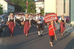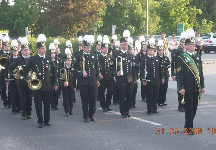 Dann marschierte Musikgruppe für Musikgruppe mit Fußmarsch aus und machte die große Runde vorbei bei der Einfahrt Möseneder, weiter Richtung Kallhamerdorf und bei den LAWOG-Bauten vorbei. Dort staute es ein wenig und die Feuerwehr kam auch schon mit einigen Kisten Ritterl daher – alles also bestens organisiert. Kurz vor 20.00 Uhr waren wir an der Reihe und marschierten vom Schwarzlmüller beginnend als vorletzte Musikgruppe weg hinunter Richtung Gemeinde. Bei der Raiffeisenbank begannen wir mit dem San Carlos, den wir aber nochmals wiederholen mussten. Vor dem neuem Gebäude stand die Tribüne und dort musste jede Musik defilieren. Nach 50 Meter wurde abgerissen und schon war der Einsatz auch schon wieder vorbei.