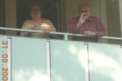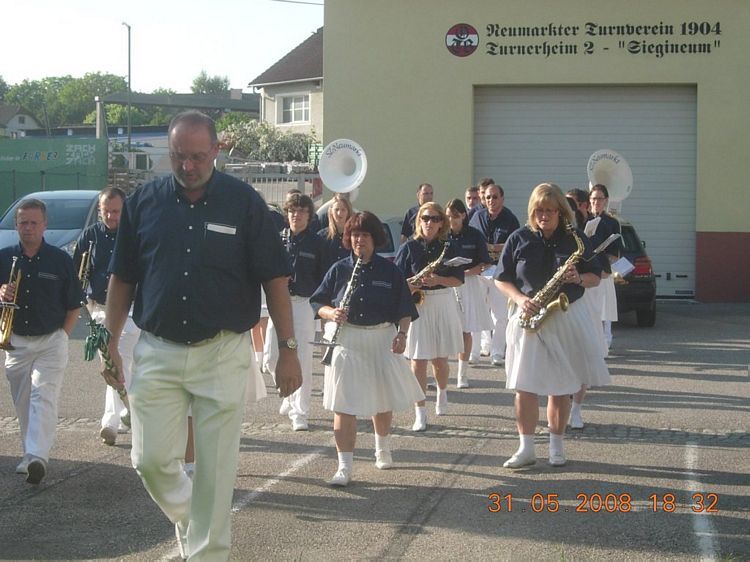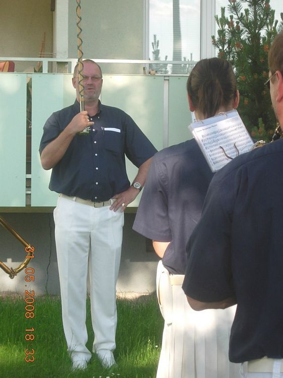 So trafen wir uns um 18.15 Uhr beim Turnerheim und gingen noch schnell in den Garten des ISG-Baues und nahmen Aufstellung. Unsere langjährige Wirtin und Mutter unseres Obmannes – Monika Stutz – feierte genau heute ihren 65. Geburtstag und da wollten wir mit einem Musikstück gratulieren. Leider hörten sie und ihr Mann nur mehr wenige Takte, da sie telefonierten, aber die Freude, Überraschung und Nervosität war trotzdem sehr groß. Alles gratulierte vom Garten hinauf auf den Balkon im 1. Stock und schon waren wir auch wieder weg.