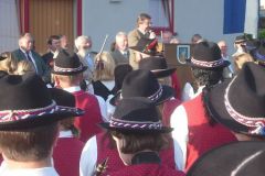 Sofort fuhren wir nach Kallham und parkten die Autos in der Nähe des neuen Gebäudes, nämlich bei der Firma Noviqua. Schon tummelte es von hunderten MusikerInnen und wir suchten unseren Aufstellungsplatz, der am Boden mit Kreide fixiert war. Wir hatten noch ein wenig Zeit und holten uns auch die Festabzeichen-Pickerl und durften zu unserer großen Überraschung auch noch Euro 70,– für die Teilnahme bezahlen. Pünktlich um 19.00 Uhr ging der Festakt los und dauerte nur eine schwache halbe Stunde. Ansprachen vom Bürgermeister und Musikobmann sowie von unserem Freund Vizepräs. Kons. Hubert Iglsböck vom OÖ Blasmusikverband und NR Bgm. Wolfgang Großruck waren die Programmpunkte. Zwischendurch wurde immer ein wenig gespielt und auch wir hatten die Noten erhalten und konnten so bei den 3 Stücken mitspielen.