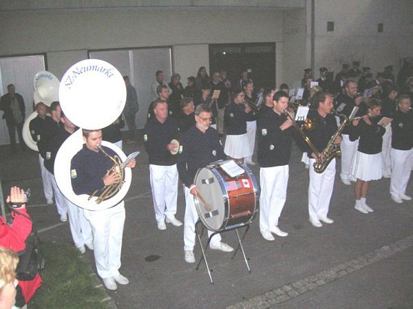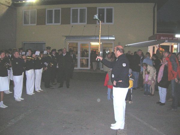 Nach monatelager Arbeit war es nun so weit und unser neuer Marktplatz konnte seiner Bestimmung übergeben werden. Natürlich durften dabei die zwei Klangkörper unserer Gemeinde nicht fehlen und wir spielten zusammen mit der Eisenbahnermusik für die Gäste. Auch LH-Stv. Franz Hiesl war gekommen und lauschte natürlich auch unseren Klängen. Wetterbedingt wurde die offizielle Eröffnung dann im Pfarrheim abgehalten und wir waren dann Zuhörer unserer Kollegen. Da die Eröffnung zufällig mit dem 60. Geburtstag unseres Bürgermeisters Bernhard Geyer zusammenfiel, wurde natürlich doppelt gefeiert und unser Obmann-Stv. Hans Leeb überbrachte die Glückwünsche des Vereines. Wie es sich gehört natürlich mit einigen Flaschen Turnerheimwein mit persönlicher Ettikette als kleines Geschenk.