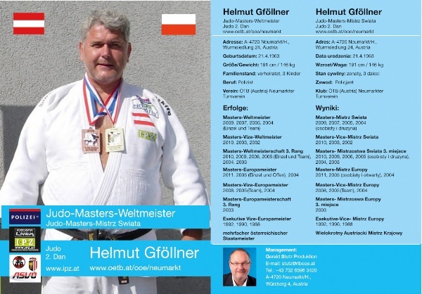 Bronzemedaille im Judo Schwergewicht – Helmut Gföllner, Austria – so hieß es am 11. Mai bei der Judo-Masters-Europameisterschaft im polnischen Opole. Der 49-jährige Polizist und Judo-Abteilungsleiter unseres ÖTB Neumarkter Turnvereines war wieder ein sicherer Medaillengewinner für Österreich, wenn auch die Titelverteidigung aus dem Vorjahr nicht ganz nach Plan funktionierte. Von den 16 gestarteten Österreichern bei dieser EM konnte leider keiner auf das oberste Treppchen steigen. 472 Judokas aus 31 Nationen waren bei dieser EM am Start.