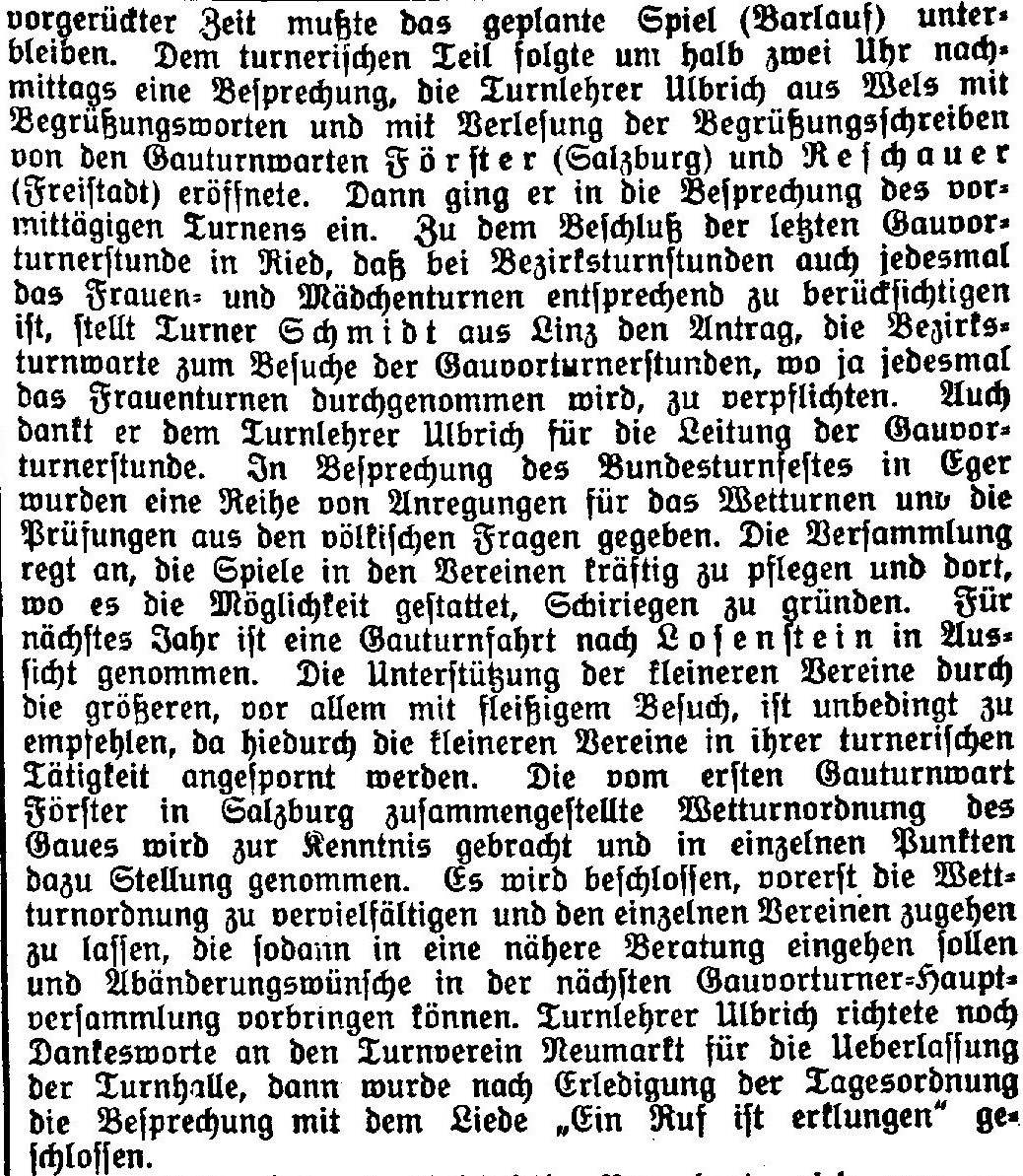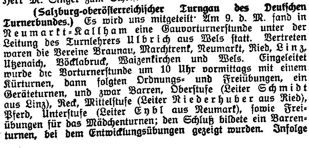 Es wird uns mitgeteilt – Am 9. d. M. fand in Neumarkt-Kallham eine Gauvorturnerstunde unter der Leitung des Turnlehrers Ulbrich aus Wels statt. Vertreten waren die Vereine Braunau, Marchtrenk, Neumarkt, Ried, Linz, Utzenaich, Vöcklabruck, Waizenkirchen und Wels. Eingeleitet wurde die Vorturnerstunde um 10 Uhr vormittags mit einem Kürturnen dann folgten Ordnungs- und Freiübungen, ein Geräteturnen, und zwar Barren. Oberstufe (Leiter Schmidt aus Linz), Reck Mittelstufe (Leiter Niederhuber aus Ried) Pferd, Unterstufe (Leiter Eybl aus Neumarkt), sowie Freiübungen für das Mädchenturnen; den Schluß bildete ein Barrensturnen, bei dem Entwicklungsübungen gezeigt wurden. Infolge vorgerückter Zeit mußte das geplante Spiel (Barlauf) unterbleiben. Dem turnerischen Teil folgte um halb zwei Uhr nachmittags eine Besprechung, die Turnlehrer Ulbrich aus Wels mit Begrüßungsworten und mit Verlesung der Begrüßungsschreiben von den Gauturnwarten Förster (Salzburg) und Reschauer (Freistadt) eröffnete. Dann ging er in die Besprechung des vormittägigen Turnens ein. Zu dem Beschluß der letzten Gauvorturnerstunde in Ried, daß bei Bezirksturnstunden auch jedesmal das Frauen- und Mädchenturnen entsprechend zu berücksichtigen ist, stellt Turner Schmidt aus Linz den Antrag, die Bezirksturnwarte zum Besuche der Gauvorturnerstunden, wo ja jedesmal das Frauenturnen durchgenommen wird, zu verpflichten. Auch dankt er dem Turnlehrer Ulbrich für die Leitung der Gauvorturnerstunde. In Besprechung des Bundesturnfestes in Eger wurden eine Reihe von Anregungen für das Wetturnen und die Prüfungen aus den völkischen Fragen gegeben. Die Versammlung regt an, die Spiele in den Vereinen kräftig zu pflegen und dort, wo es die Möglichkeit gestattet, Schiriegen zu gründen. Für nächstes Jahr ist eine Gauturnfahrt nach Lofenstein in Aussicht genommen. Die Unterstützung der kleineren Vereine durch die größeren, vor allem mit fleißigem Besuch, ist unbedingt zu empfehlen, da hiedurch die kleineren Vereine in ihrer turnerischen Tätigkeit angespornt werden. Die vom ersten Gauturnwart Förster in Salzburg zusammengestellte Wetturnordnung des Gaues wird zur Kenntnis gebracht und in einzelnen Punkten dazu Stellung genommen. Es wird beschlossen, vorerst die Wetturnordnung zu vervielfältigen und den einzelnen Vereinen zugehen zu lassen, die sodann in eine nähere Beratung eingehen sollen und Abänderungswünsche in der nächsten Gauvorturner-Haupt-Versammlung vorbringen können. Turnlehrer Ulbrich richtete noch Dankesworte an den Turnverein Neumarkt für die Ueberlassung der Turnhalle, dann wurde nach Erledigung der Tagesordnung die Besprechung mit dem Liede „Ein Ruf ist erklungen“ geschlossen.