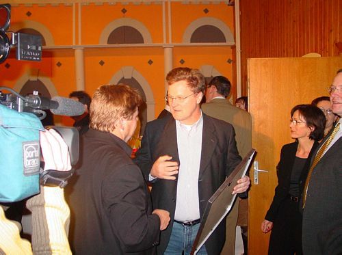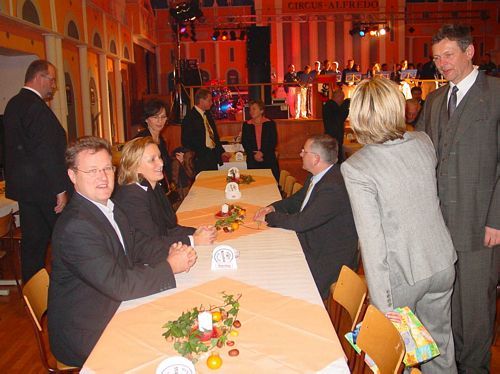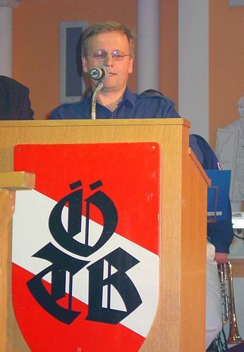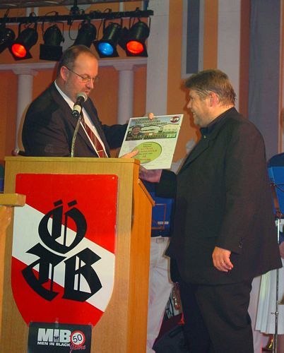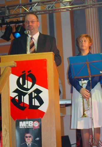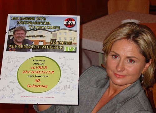 Ab 19.15 Uhr kamen die Gäste und nach wenigen Minuten begann auch der Spielmannszug auf der Bühne zu spielen. Die Gästeschar wurde immer größer und nahm schön langsam nach einem Sektempfang bei den Tischen Platz. Um 20.15 Uhr war es dann soweit und unser Obmann eröffnete als Moderator diesen Abend. Zunächst gab es die Glückwünsche des Turnvereines in Form einer kleinen Laudatio, ein Gedicht von Rainer Gruber geschrieben und von Obmann-Stv. Hans Leeb vorgetragen und als Geschenk eine persönliche Briefmarke “100 Jahre ÖTB Neumarkter Turnverein“ und “50 Jahre Alfred Zechmeister“. Damit hatte das Geburtstagkind eine wirkliche Freude und er durfte als letztes Stück des Spielmannszuges auch noch gleich den “Neumarkter Turnermarsch“ dirigieren. Dann ging es Schlag auf Schlag und unser Obmann lud im Namen des Geburtstagskindes zuerst zum Buffet, ehe dann viele Vereine, Gruppen, Firmenvertreter etc. gratulierten. Um 23.00 Uhr war dann der nächste Höhepunkt – unsere Se Oritschinel Goatnzauns begann zu spielen. Auch sie hatten sich für Alfred was nettes ausgedacht und komponierten ihm einen einen IPZ-Rap, der nicht nur bei Fred sondern beim ganzen Publikum super ankam.