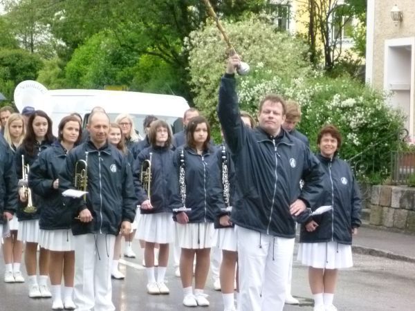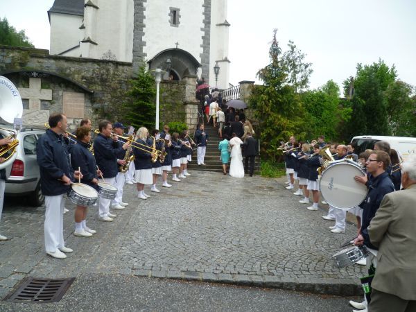 Der Spielmannszug traf sich um 12:45 Uhr beim Turnerheim, packte seine Instrumente ein und fuhr nach Taufkirchen/Parm wo die kirchliche Trauung und die anschließende Hochzeitsfeier stattfanden. Bei leichtem Nieselregen traf das Brautpaar am Marktplatz in Taufkirchen ein und der Spielmannszug führte den Hochzeitszug zur Kirche an. Wie so oft spielten wir bei der wunderschönen Messe unseren Klassiker „One Moment in Time“.