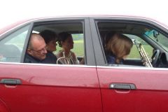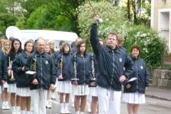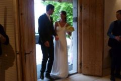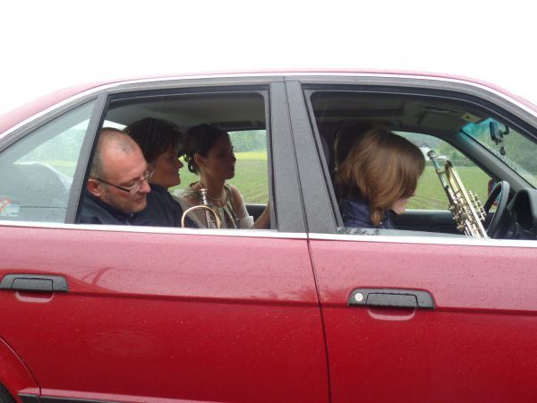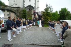 Als das Brautpaar aus der Kirche kam, stand der SZ schon wieder bereit und empfing es mit einigen Märschen, bevor sich die ganze Hochzeitsgesellschaft auf den Weg Richtung Rahaberghof machte. Aufgrund des mäßigen Wetters fiel der Sektempfang im Freien leider ins Wasser und somit war der SZ-Einsatz vorzeitig beendet. Die meisten Spielleute wechselten die Uniform in festliche Kleidung und die Hochzeitsfeier konnte beginnen!