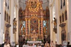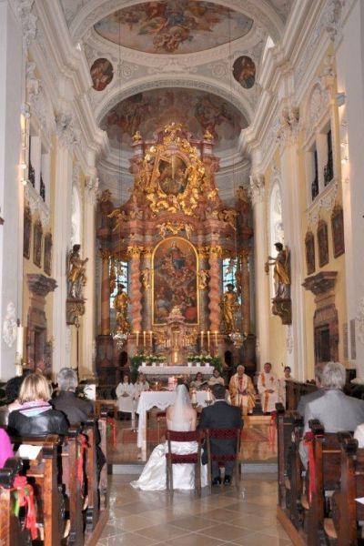 Der Spielmannszug führte den Hochzeitszug in die Pfarrkirche an und spielte die Gäste und das Brautpaar in die Kirche. Als Brautlied spielte der Spielmannszug wie so oft den wunderschönen Klassiker „One Moment in Time“.