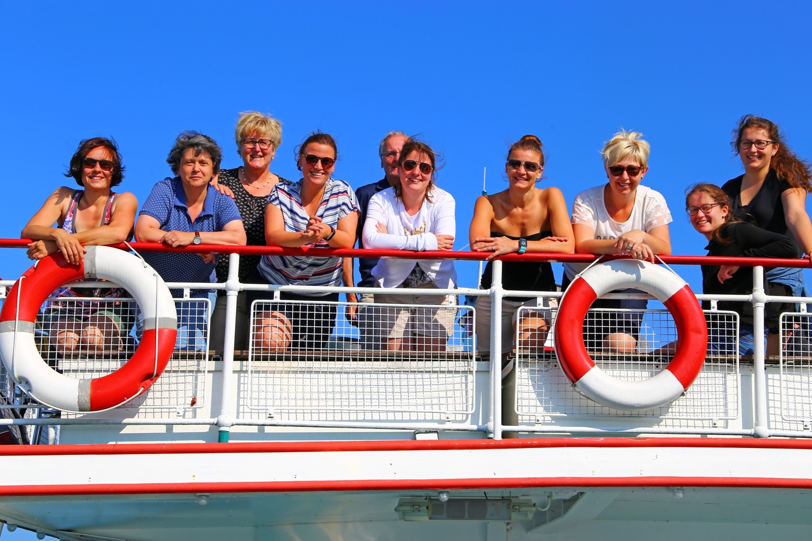 Der Samstag stand im Zeichen von See, Wein und Zeppelin. Mit dem Schiff fuhren wir von Bregenz nach Kressbronn, wo wir am Abend ein Konzert im Seegarten spielen werden. Dort holte uns der Bus und brachte uns nach Friedrichshafen, wo das Zeppelin-Museum, die lange Uferpromenade und die Innenstadt besichtigt wurden. Am Nachmittag fuhren wir nach Nonnenhorn, wanderten durch die Weinberge mit herrlichem Blick auf den Bodensee und besichtigten das Weingut Hornstein, ehe wir nach Kressbronn zur Seegarten fuhren und ein Konzert gaben.