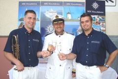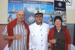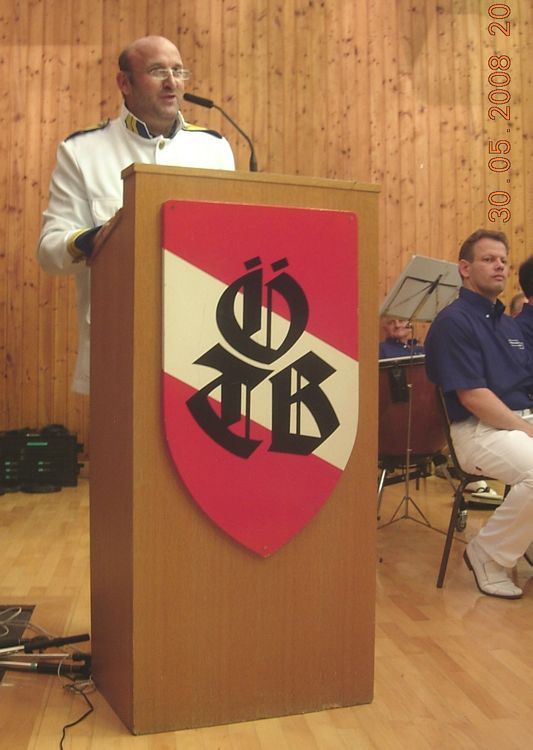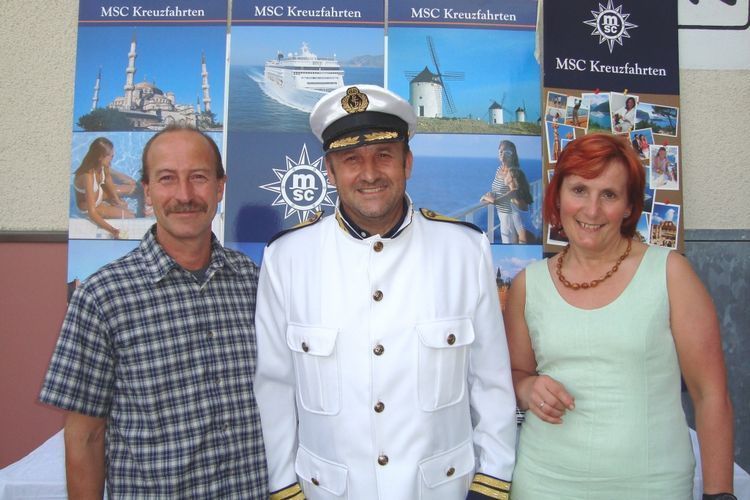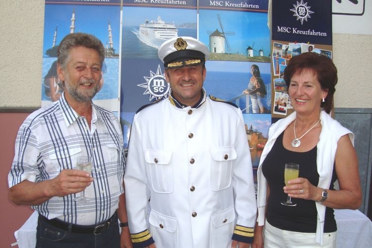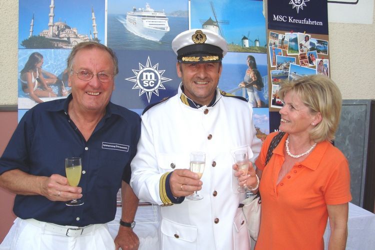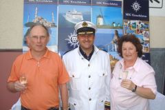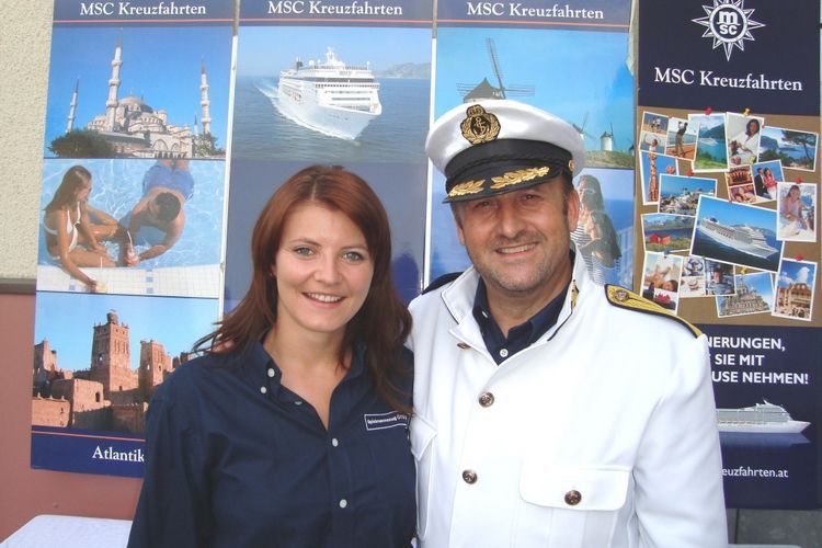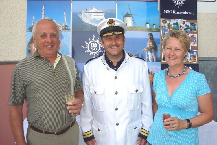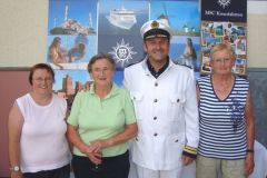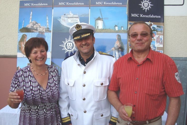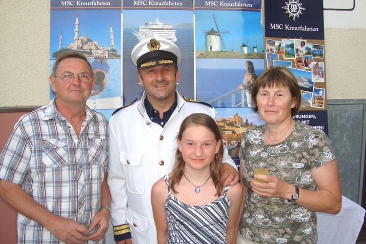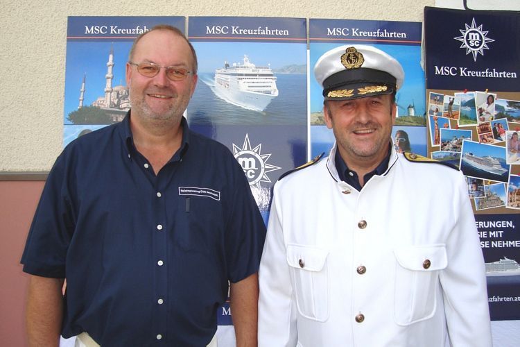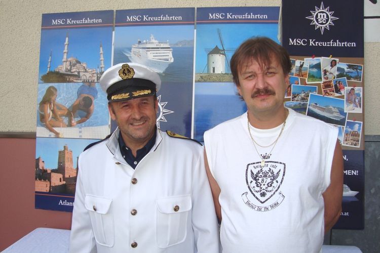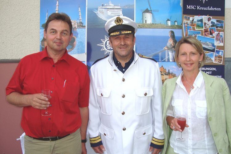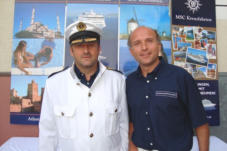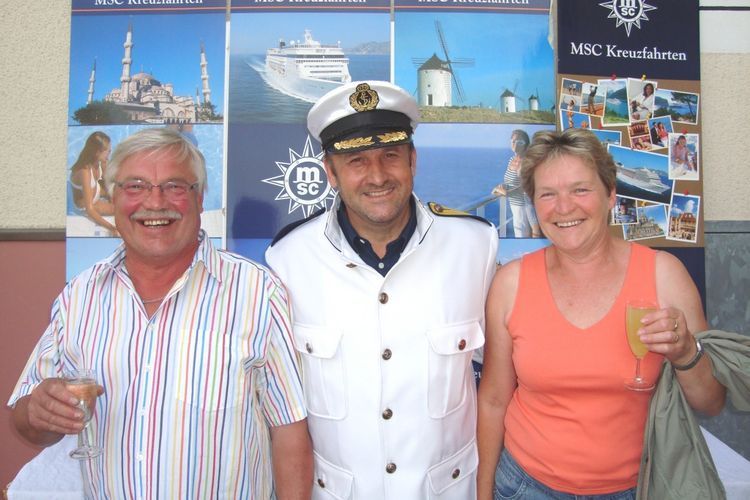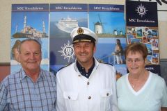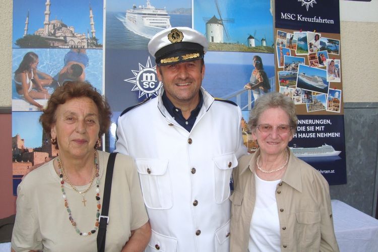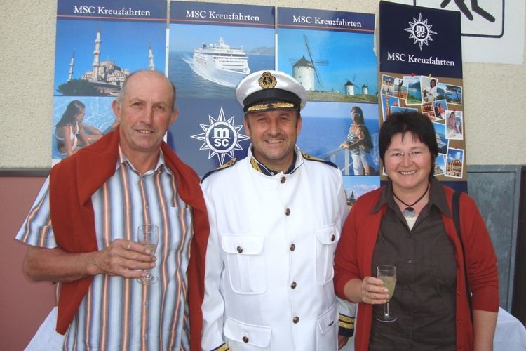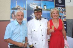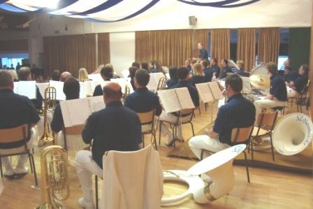 Ziel war es, neben den 170 Teilnehmern unserer Kreuzfahrt auch weitere interessierte Gäste für diese Art des Reisens zu gewinnen, was uns im nachhinein auch gelungen sein dürfte. Eine Menge von Ideen kam zusammen und zum Schluss einigten wir uns auch ein abwechslungsreiches und kurzweiliges Programm. Um 19.00 Uhr kamen einige Spielleute zusammen, um bereits die Gäste – und viele kamen auch schon um 19.00 Uhr – mit einem Glas Prosecco zu begrüßen. Unser Spielmannszug-Chef verkleidete sich als Kapitän und alle Kreuzfahrtteilnehmer konnten sich mit ihm vor einer MSC-Wand fotografieren lassen. Diese Fotos wurden später zugesandt bzw. persönlich übergeben. Der Rest der Spielleute traf sich um 19.30 Uhr und kurz vor Beginn mussten wir auch noch Tische und Sessel aufstellen, sodass am Ende ca. 260 Gäste kamen, zuzüglich 36 Spielleute und ca. 20 Personen Personal. Um 20.10 Uhr eröffnete die vom Fernsehen bekannte Traumschiffmelodie diesen Abend, während die Spielleute auf der Bühne Platz nahmen. Sogleich wurde Musik ist Trumpf gespielt, ehe der SZ-Chef Manfred Schöberl und anschließend der Obmann und Reisebegleiter Gerald Stutz die Begrüßung vornahmen. Herzlich willkommen hieß Gerald den seit wenigen Wochen neu im Amt befindlichen Bürgermeister von Neumarkt, unser Mitglied Johann Floß sowie den neuen Vizebürgermeister Mag. Florian Wild. Aus Linz kamen von der Reisewelt die Organisatorin unserer Kreuzfahrt Elli Gillinger, sowie der Chef der Gruppenabt. der Reisewelt Mag. Thomas Loifellner. Nach der Begrüßung spielte der Spielmannszug noch zwei Stücke, das modernere Abba Gold und den Traditionsmarsch Mein Heimatland.