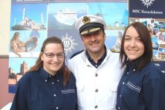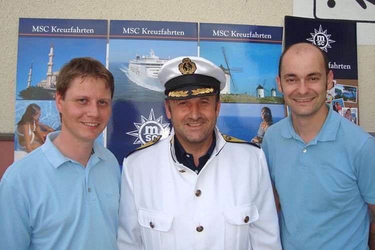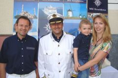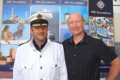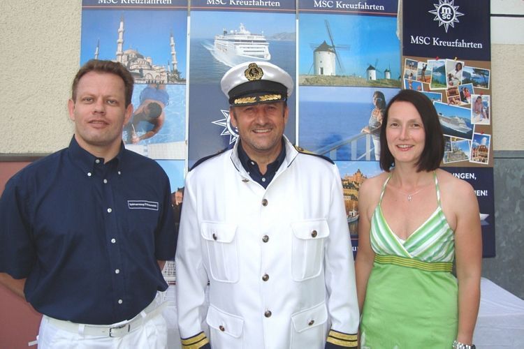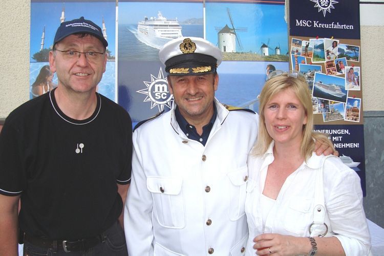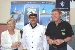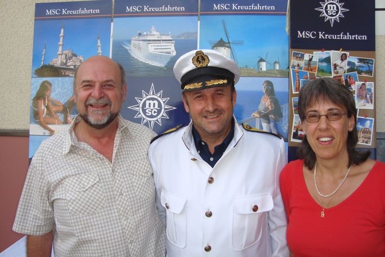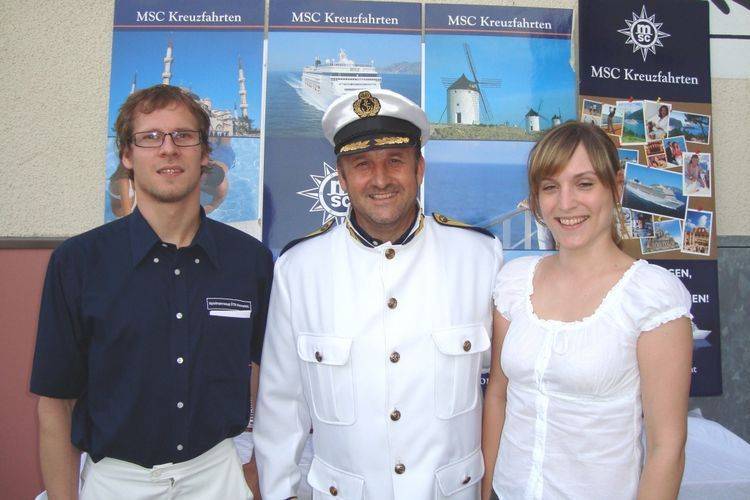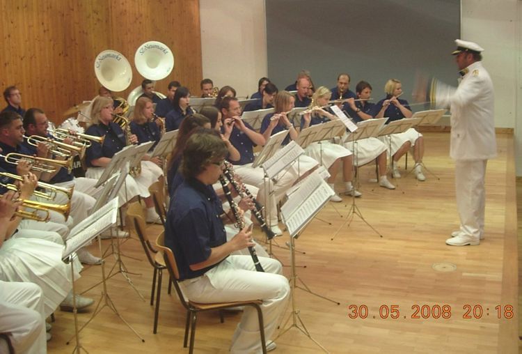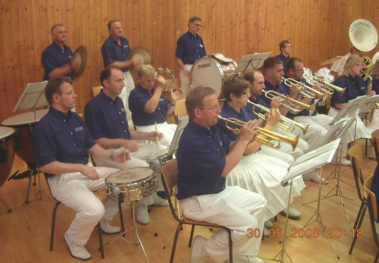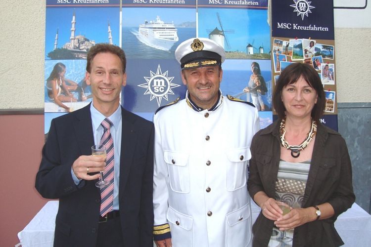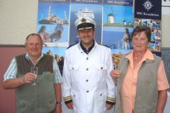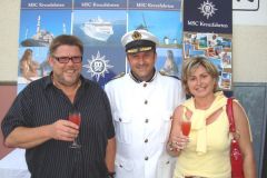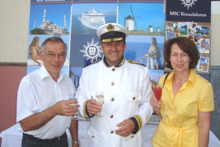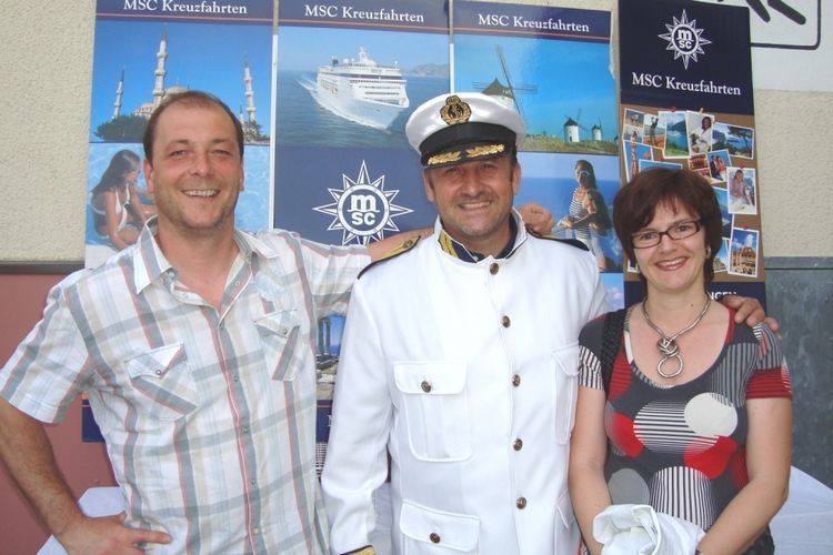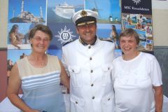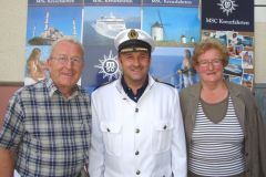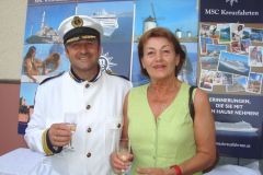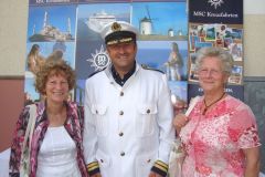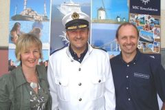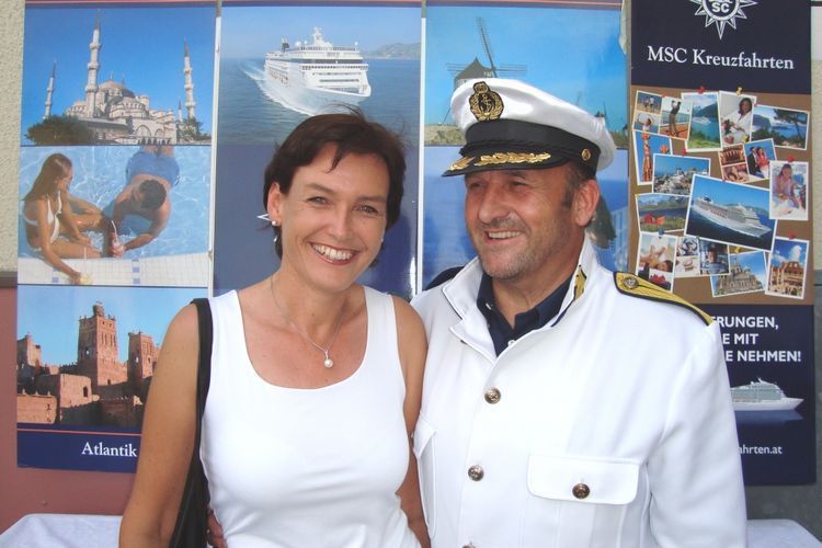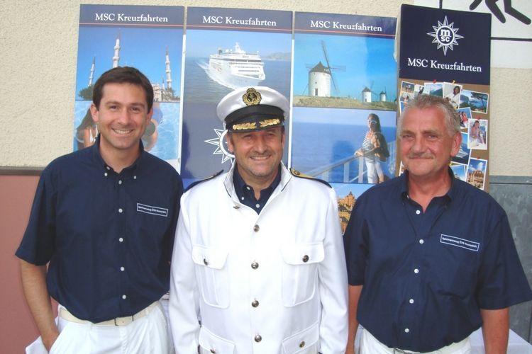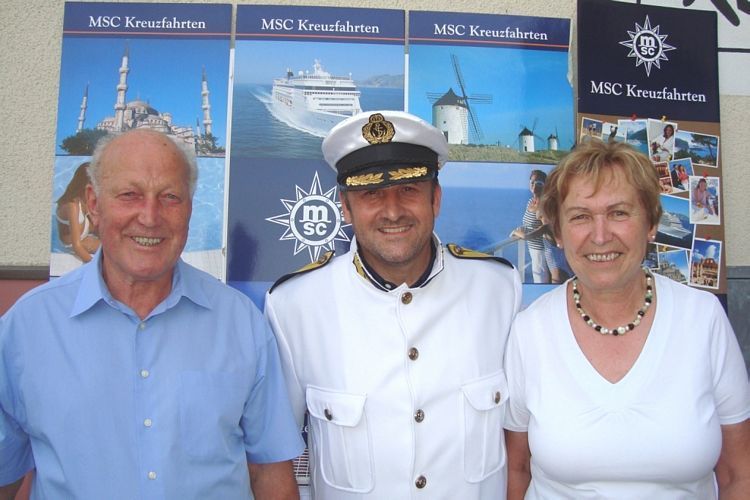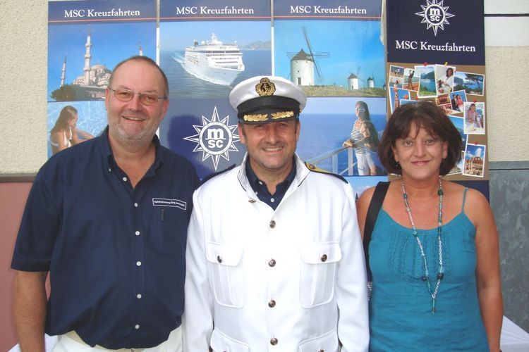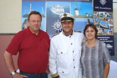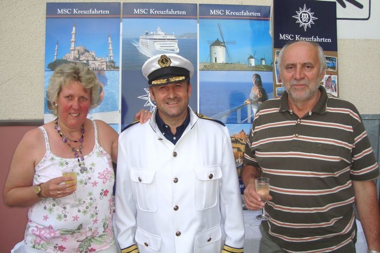 Ziel war es, neben den 170 Teilnehmern unserer Kreuzfahrt auch weitere interessierte Gäste für diese Art des Reisens zu gewinnen, was uns im nachhinein auch gelungen sein dürfte. Eine Menge von Ideen kam zusammen und zum Schluss einigten wir uns auch ein abwechslungsreiches und kurzweiliges Programm. Um 19.00 Uhr kamen einige Spielleute zusammen, um bereits die Gäste – und viele kamen auch schon um 19.00 Uhr – mit einem Glas Prosecco zu begrüßen. Unser Spielmannszug-Chef verkleidete sich als Kapitän und alle Kreuzfahrtteilnehmer konnten sich mit ihm vor einer MSC-Wand fotografieren lassen. Diese Fotos wurden später zugesandt bzw. persönlich übergeben. Der Rest der Spielleute traf sich um 19.30 Uhr und kurz vor Beginn mussten wir auch noch Tische und Sessel aufstellen, sodass am Ende ca. 260 Gäste kamen, zuzüglich 36 Spielleute und ca. 20 Personen Personal. Um 20.10 Uhr eröffnete die vom Fernsehen bekannte Traumschiffmelodie diesen Abend, während die Spielleute auf der Bühne Platz nahmen. Sogleich wurde Musik ist Trumpf gespielt, ehe der SZ-Chef Manfred Schöberl und anschließend der Obmann und Reisebegleiter Gerald Stutz die Begrüßung vornahmen. Herzlich willkommen hieß Gerald den seit wenigen Wochen neu im Amt befindlichen Bürgermeister von Neumarkt, unser Mitglied Johann Floß sowie den neuen Vizebürgermeister Mag. Florian Wild. Aus Linz kamen von der Reisewelt die Organisatorin unserer Kreuzfahrt Elli Gillinger, sowie der Chef der Gruppenabt. der Reisewelt Mag. Thomas Loifellner. Nach der Begrüßung spielte der Spielmannszug noch zwei Stücke, das modernere Abba Gold und den Traditionsmarsch Mein Heimatland.