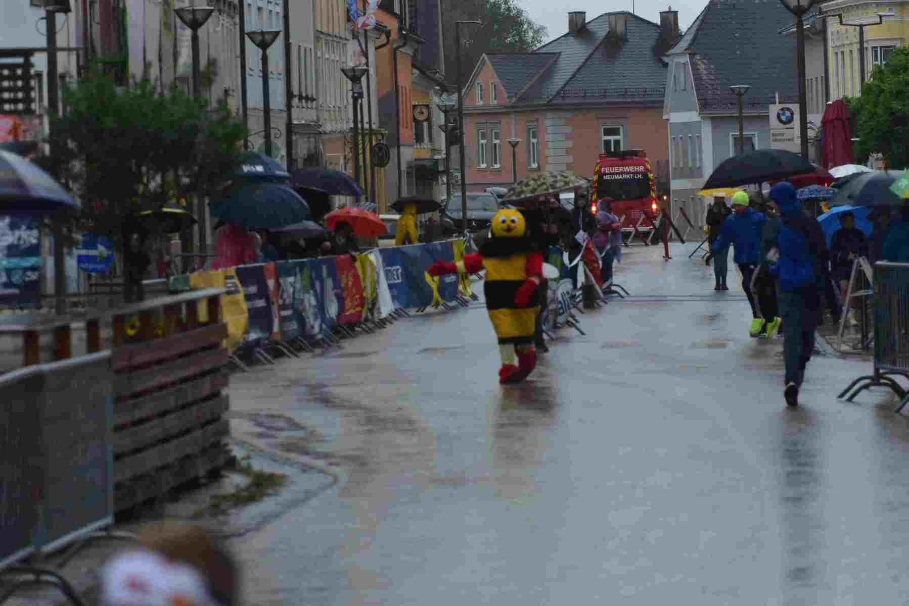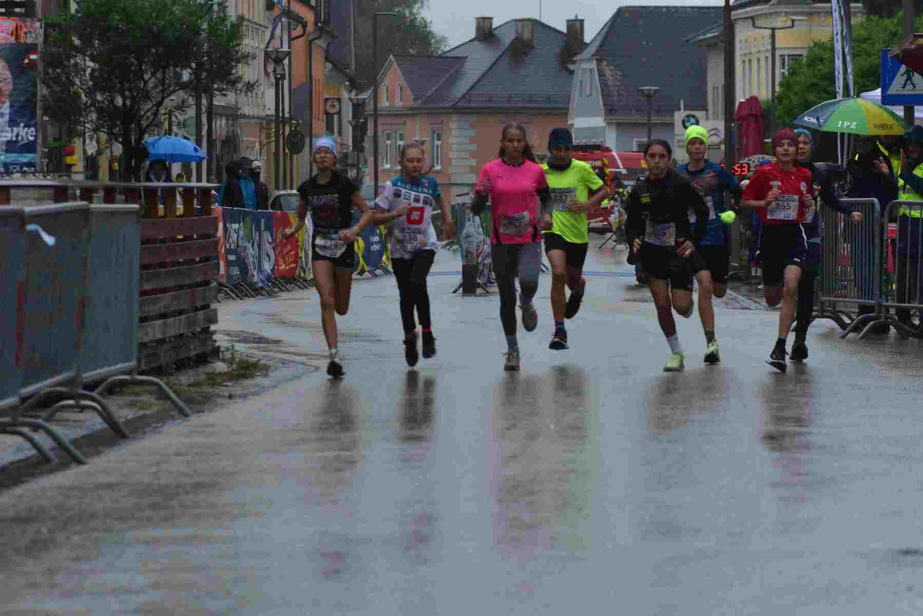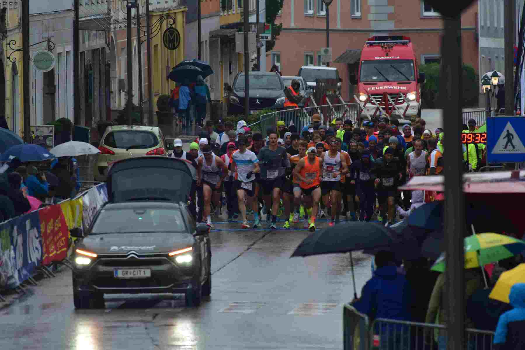 Mit einem Laufbewerb für ALLE beschenkte sich der ÖTB Neumarkter Turnverein 1904 zum 120jährigen Vereinsjubiläum am 14. September selbst! Zum ersten Mal fand in Neumarkt/H. ein 5 km Laufbewerb statt, bei dem fünf Runden um den Neumarkter Marktplatz im Volkslauf zu absolvieren waren. Geplant war freilich, dass im Start/Zielbereich am Marktplatz Volksfeststimmung herrscht, dass die Fans in den zahlreichen Gastgärten in der Sonne sitzen und die Läufer lautstark anfeuern. Geworden ist es ein Regenrennen und die Gastgärten waren geschlossen. Die Fans jedoch gaben trotz Regens und Windes ihr Bestes und trieben die Läufer Runde um Runde zu Bestleistungen an.