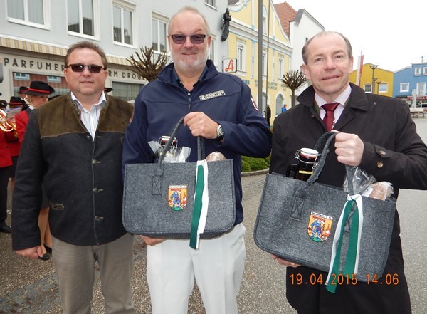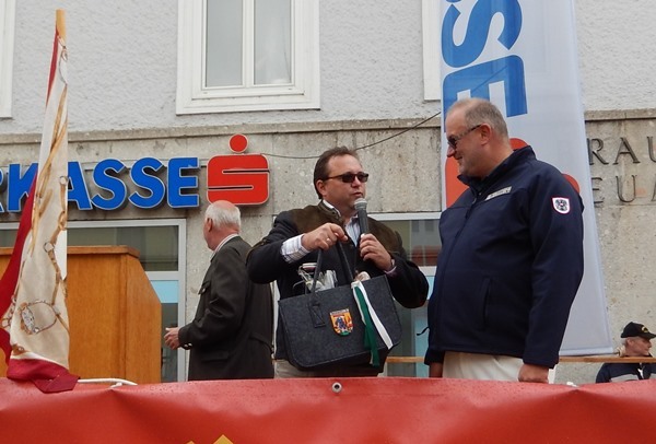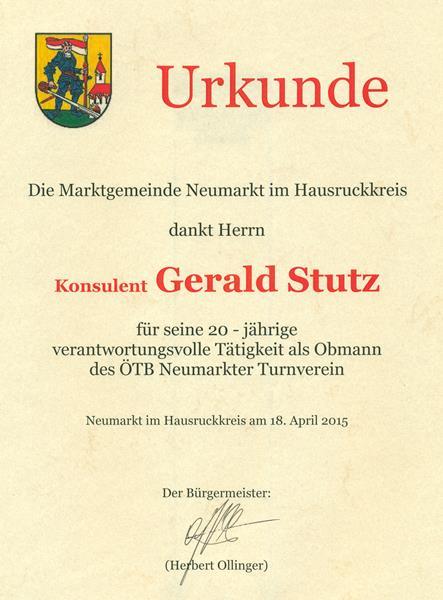 Seit dem Jahre 1994 steht unser Obmann VBgm. Konsulent Gerald Stutz unserem ÖTB Neumarkter Turnverein mit seinen 560 Mitgliedern als Verantwortlicher vor. Dieser lange Zeitraum war für die Marktgemeinde Neumarkt/H. Anlass, diesen verdienten Funktionär zu ehren. Den Rahmen bildete der Neumarkter Pferdemarkt am Samstag, den 18. April, wo auch der Spielmannszug zum Einsatz kam und daher auch unser Obmann wieder einmal in Neumarkt verweilte. Bürgermeister Herbert Ollinger würdigte auf der Bühne die lange Amtszeit von Gerald Stutz und überreichte ihm als Dankeschön der Marktgemeinde eine Urkunde und die erste Neumarkter Geschenkseinkaufstasche, gefüllt mit Produkten, die nur in Neumarkt hergestellt werden. Auch Landesrat Max Hiegelsberger gratulierte zu dieser Auszeichnung und bekam natürlich auch eine gefüllte Tasche.