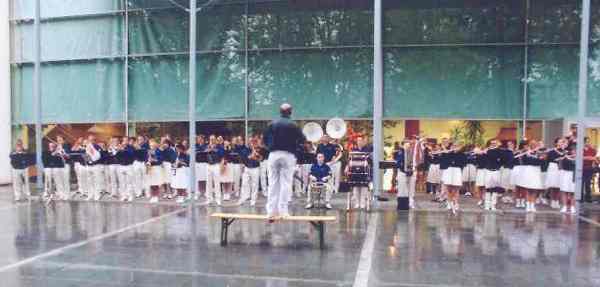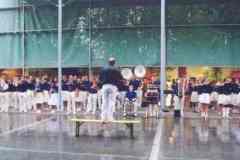 Immer kleiner wurde das Häufchen, welches von Neumarkt nach Steyr fuhr, denn an diesem Tag waren auch die älteren Spielleute turnerisch im Einsatz. In Steyr angekommen war es noch heiß, aber vor Beginn des Einsatzes beim Schauturnen fing es zu regnen an und dieser Regen wurde immer ausgiebiger. Es wurde viel hin und her telefoniert, bis endlich der Befehl kam, dass der Einsatz stattfindet und zwar im Foyer der Stadthalle, wo das Schauturnen stattfand. Auch dieses Mal wurde im Landesspielmannszug gespielt und unser Fred übernahm die Stabführung. Nach diesem kurzen Auftritt vor wenigen Zuschauern, denn diese mussten im Regen stehen, war der Einsatz vorbei. Die Jugend und ihre Betreuer schauten sich das Schauturnen an, der Rest fuhr ins Quartier bzw. ging in unser Stammlokal und ließ dort den Abend ausklingen. Diesen Abend blieben fast alle Spielleute in Steyr, denn am nächsten Tag war das Vereinswettturnen und dort machten viele Spielleute mit.