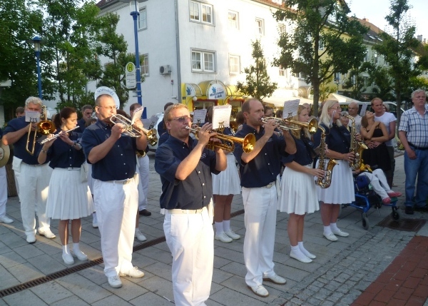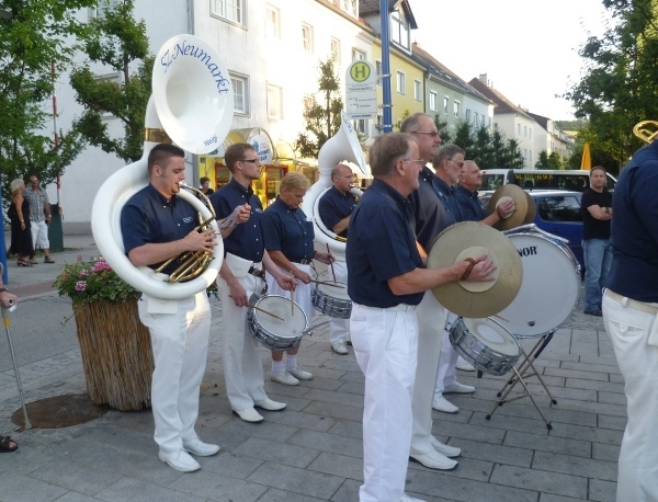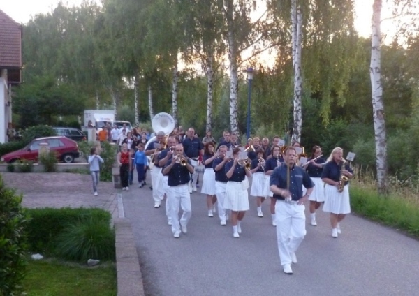 Der traditionelle Einsatz bei der Sonnwendfeier unserer Freunde des ÖTB Bad Schallerbach stand auf dem Programm. Obwohl der Wetterbericht für diesen Freitag nicht allzu gutes verhieß, hatten die Schallerbacher Freunde dieses Mal wieder Glück. Wir versammelten uns um 19.00 Uhr beim Probelokal und fuhren wir knapp 20 Spielleuten nach Bad Schallerbach. Es gesellten sich beim Parkplatz neben der Badstraße dann aber auch noch einige Spielleute dazu, die selbst von zu Hause etc. anreisten, sodass wir am Ende doch 25 waren. Die Autos stellten wir, bis auf einige ausnahmen, wieder am Parkplatz in der Badstraße ab und kurz vor 19.30 Uhr nahmen wir Aufstellung und marschierten unter der Stabführung von Steiner Wolfgang durch die Badstrasse zum Marktplatz.