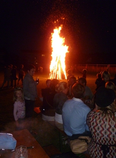Dort angekommen war bis auf die Blechbläser der Einsatz für den Rest der Spielleute beendet und wir verstauten die Instrumente in den Autos, die wir vorher noch vom Parkplatz holten. Dank der ausgegebenen Essens- und Getränkemarkerl konnten wir uns sofort um Bratwürstel und Bier anstellen. Nach Abwarten der Dämmerung spielten unsere Blechbläser einen Ruf sowie das Homatland und dann wurde der hohe Feuerstoß entzündet. Somit waren alle Spielleute fertig und gemütlich setzten wir uns noch auf ein Bier, ehe es zu kühl wurde. Die meisten Spielleute fuhren gegen 22.15 Uhr nach Hause. Wir wünschten uns nur, dass auch wir am nächsten Tag bei unserer eigenen Sonnwendfeier ein solches Wetterglück bekommen würden, was leider nicht der Fall war und wir unsere Feier zwecks Dauerregen absagen mussten. Das Entzünden das Holzstoßes holten wir am Mittwoch, den 22. Juni nach.