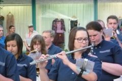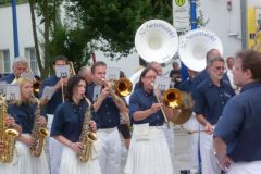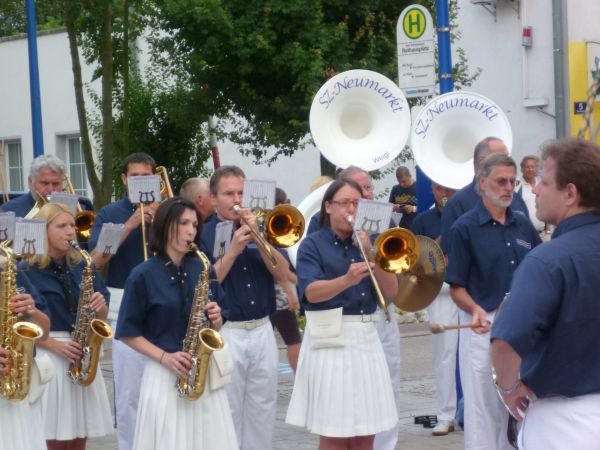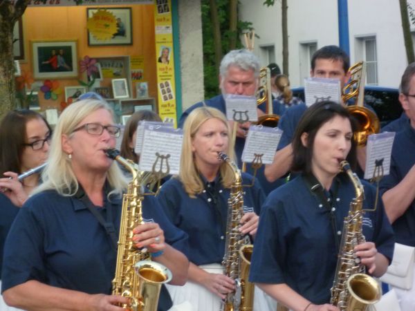 Der traditionelle Einsatz bei der Sonnwendfeier unserer Freunde des ÖTB Bad Schallerbach stand auf dem Programm. Der Wetterbericht war sehr gut und gab auch uns Hoffnung für unsere eigene Sonnwendfeier am nächsten Tag. Wir versammelten uns um 18.45 Uhr beim Probelokal und fuhren mit knapp 30 Spielleuten nach Bad Schallerbach. Es gesellten sich in Bad Schallerbach dann aber auch noch einige Spielleute dazu, die selbst von zu Hause etc. anreisten, sodass wir am Ende 34 waren. Die Autos stellten wir, bis auf einige ausnahmen, wieder am Parkplatz in der Badstraße ab und kurz vor 19.30 Uhr nahmen wir Aufstellung und marschierten unter der Stabführung von Steiner Wolfgang durch die Badstrasse zum Marktplatz.