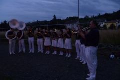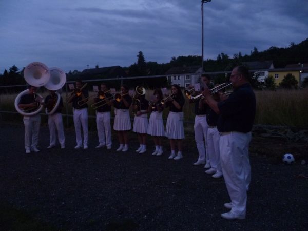 Dort angekommen war bis auf die Blechbläser der Einsatz für den Rest der Spielleute beendet und wir verstauten die Instrumente in den Autos, die wir sofort noch vom Parkplatz holten. Dank der ausgegebenen Essens- und Getränkemarkerl konnten wir uns um Bratwürstel und Bier anstellen und das EM-Fußball-Viertelfinale Deutschland gegen Griechenland ansehen, welches die Deutschen mit 4:2 gewannen. Nach Abwarten der Dämmerung spielten unsere Blechbläser einen Ruf sowie das Homatland und dann wurde der hohe Feuerstoß entzündet. Somit waren alle Spielleute fertig und gemütlich setzten wir uns noch auf ein Bier. Die meisten Spielleute fuhren gegen 22.15 Uhr nach Hause. Wir wünschten uns nur, dass auch wir am nächsten Tag bei unserer eigenen Sonnwendfeier ein solches Wetterglück bekommen würden, was auch eintraf.