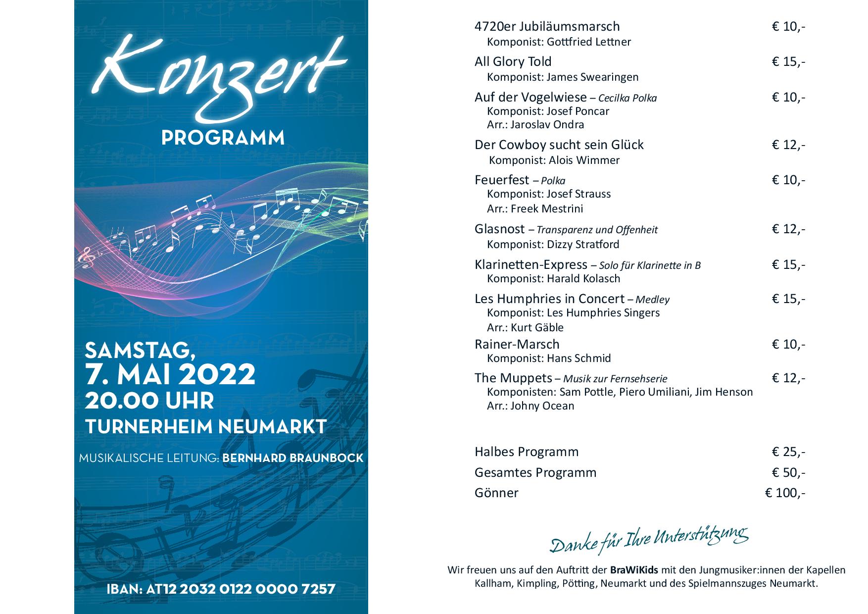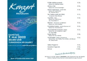 Ich habe lange überlegt, wie ich meine Gedanken zum Konzert des Spielmannszugs Neumarkt am 7. Mai 2022 am besten in Worte fassen könnte. Möglichst minimalistisch und in nur einem Wort würde ich sagen: Endlich! Endlich wieder fokussiert auf ein Konzert hinproben und hinfiebern, endlich wieder auf der Bühne sitzen und gemeinsam vor Publikum musizieren, endlich wieder den Teamgeist bei einem großen gemeinsamen Projekt spüren, endlich wieder in lachende Gesichter blicken, wenn Fred mit Charme und Schmäh durchs Programm führt. Endlich wieder von den Scheinwerfern geblendet, verschwitzt und ohne Ansatz am Ende des Konzerts aufstehen und denken: Das war’s. Das war’s, was uns so lange gefehlt hat und wofür wir uns jeden Freitag zum Proben treffen. Das, und natürlich die gemütliche und ausgelassene „Konzertnachbesprechung“ bis in die frühen Morgenstunden 😉