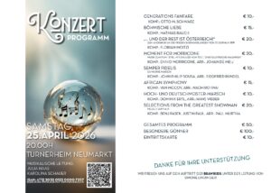 Der Abend verspricht eine Reise durch verschiedenste, nicht nur musikalische Welten. Das Programm spannt einen Bogen von klassischen Marsch- und Polkaklängen über Musicalhits bis zu modernen, überraschenden Arrangements.