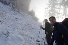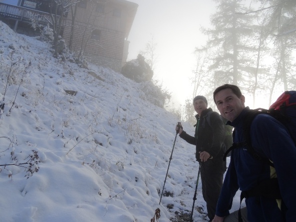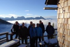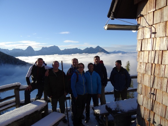 Im Nebelbad ging es die 800 Höhenmeter im Eiltempo bergan. Ab der Hälfte des Weges fanden wir immer mehr Schnee vor, erst auf den Baumwipfeln, dann auch am Boden und schließlich gingen wir die letzten Höhenmeter auf einer guten Schneeunterlage zur Hütte hinauf. Oben angekommen wartete schon ein kühles Bier auf die Bergkameraden. Als Dank für die Mühe des Aufstiegs hatten wir ein wunderbares Bergpanorama vor uns. Während im Tal der Nebel alles einhüllte leuchteten die umliegenden Gipfel in der untergehende Sonne. Ein herrlicher Anblick, für den es sich lohnt einen Berg zu besteigen.