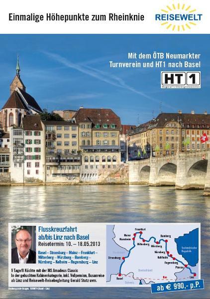 Als Organisator und Reisebegleiter dieser HT1-Seher-Flusskreuzfahrt ist es mir eine große Freude, nun den Kurzbericht über diese gemeinsam 9 erlebten Tage auf den schönsten Flüssen Europas zu präsentieren. Mit dem ÖTB Neumarkter Turnverein nach Basel – das war das Motto unserer Reise und wir haben unser Motto auch gelebt. Fast jeden Tag eine andere interessante Stadt, ein traumhaftes Wetter während der ganzen Reise, ein edles ****+Schiff mit ausgezeichnetem Service und viel Essen – das waren kurz gesagt jene Punkte, die wir gemeinsam mit über 100 Teilnehmern erleben durften.