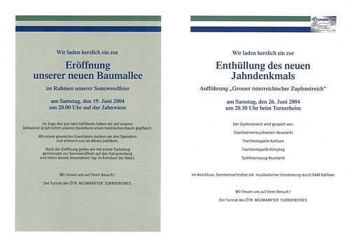Es gab Anfang 2004 ganze 88 Jahndenkmäler in Österreicht. Das 89. Jahndenkmal sollte in Neumarkt beim Turnerheim einen würdigen Platz bekommen. Obmann Gerald Stutz nahm das Jubiläumsjahr 2004 zum Anlass und stiftete ein würdiges Denkmal. Bei einer großen Feier mit Österreichischem Zapfenstreich und großem Feuerwerk wurde es am 26. Juni 2004 enthüllt.